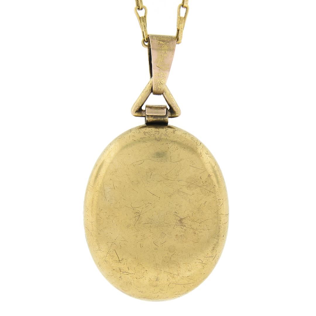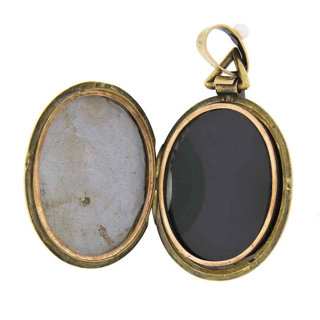 An antique solid 14k yellow gold locket pendnat necklace, with 41 rose cut natural diamonds (H-J - SI1-I2 ; 0.25ct ), and 6 round shape cultured pearls (3.6-4.6mm). 17 inch fancy link chain, 35.33 grams total weight, pendant measures 63x34.7mm.