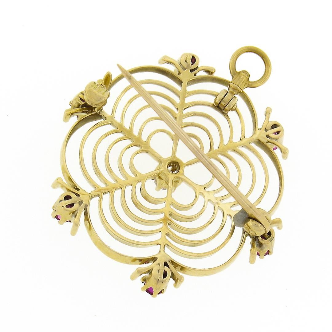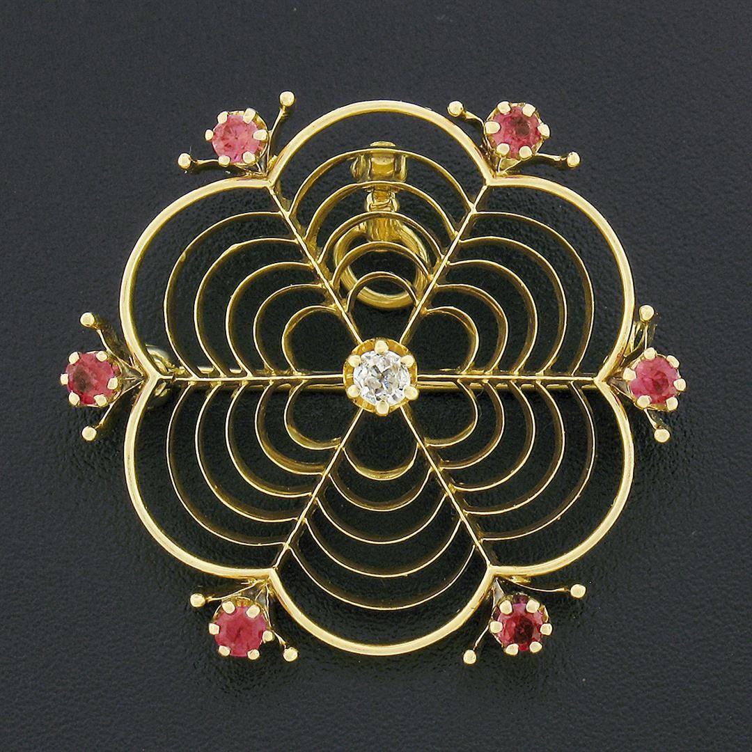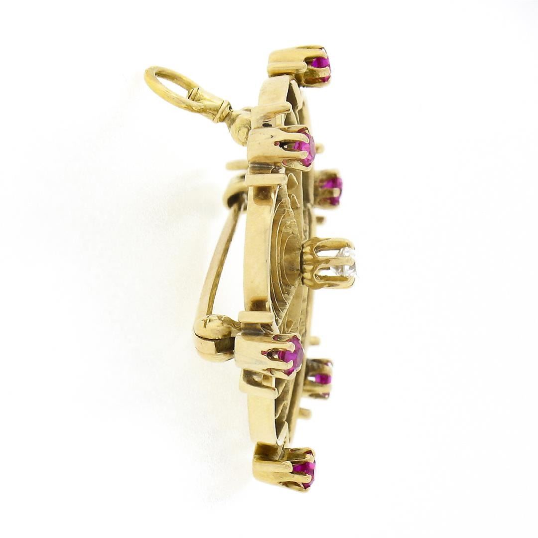An antique solid 14k yellow gold pin brooch pendant, with 6 round brilliant cut red stones (2.35mm each), and 1 old mine cut natural diamond (H - VS2 ; 0.10ct). Measures 31.80x33.15mm and weighs a total of 5.59 grams.