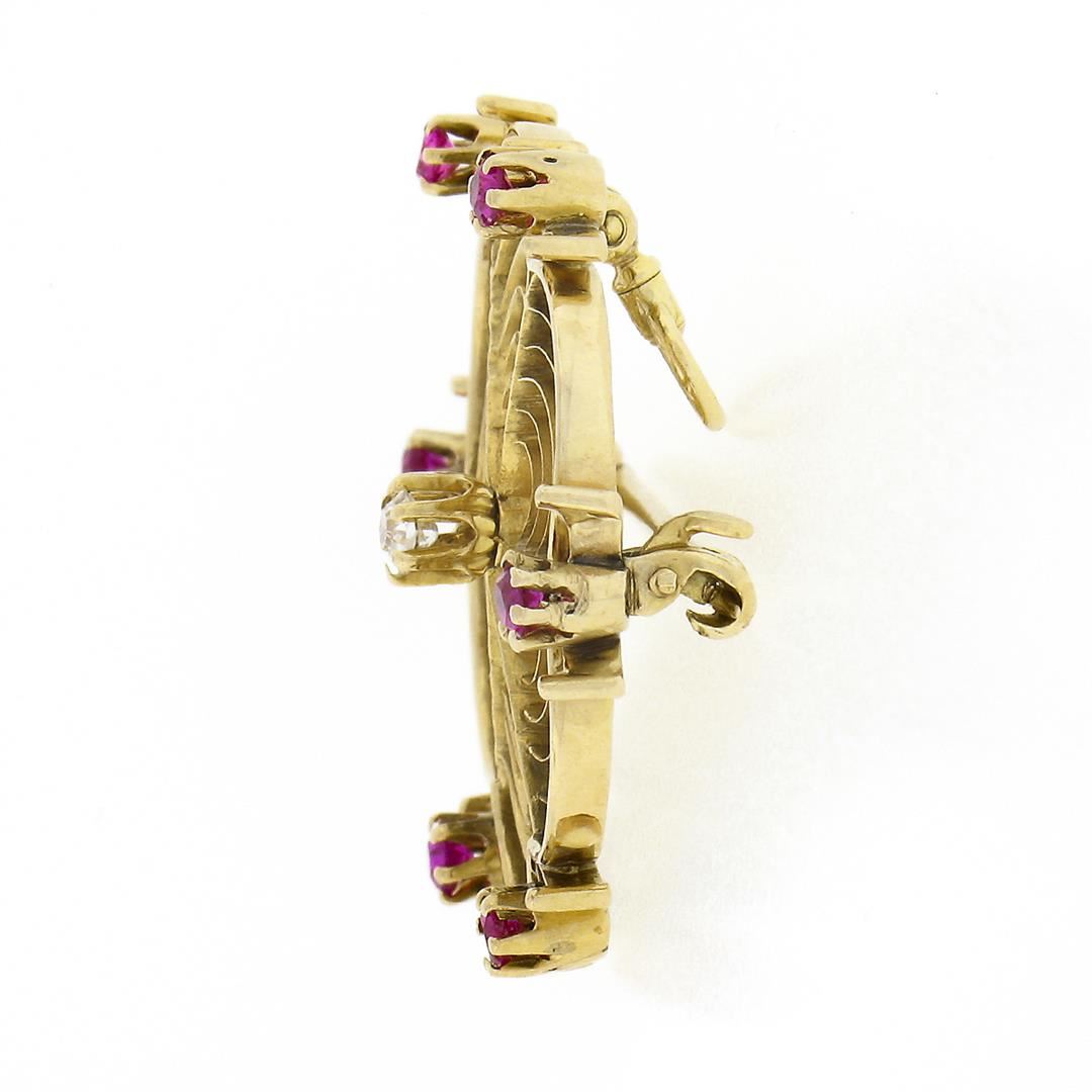 An antique solid 14k yellow gold pin brooch pendant, with 6 round brilliant cut red stones (2.35mm each), and 1 old mine cut natural diamond (H - VS2 ; 0.10ct). Measures 31.80x33.15mm and weighs a total of 5.59 grams.