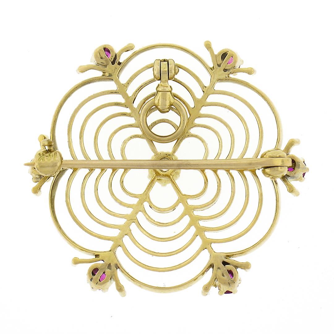 An antique solid 14k yellow gold pin brooch pendant, with 6 round brilliant cut red stones (2.35mm each), and 1 old mine cut natural diamond (H - VS2 ; 0.10ct). Measures 31.80x33.15mm and weighs a total of 5.59 grams.