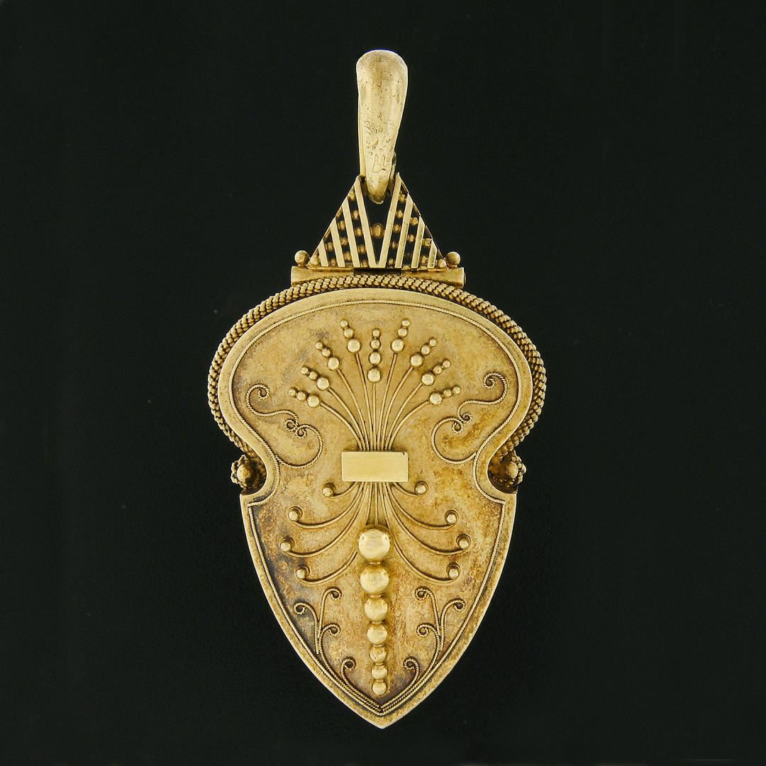 An antique solid 14k yellow gold shield pendant. The pendant weighs a total of 13.43 grams, measures 61.60x31mm including the bail, and the inside of the bail measures ##x##mm.