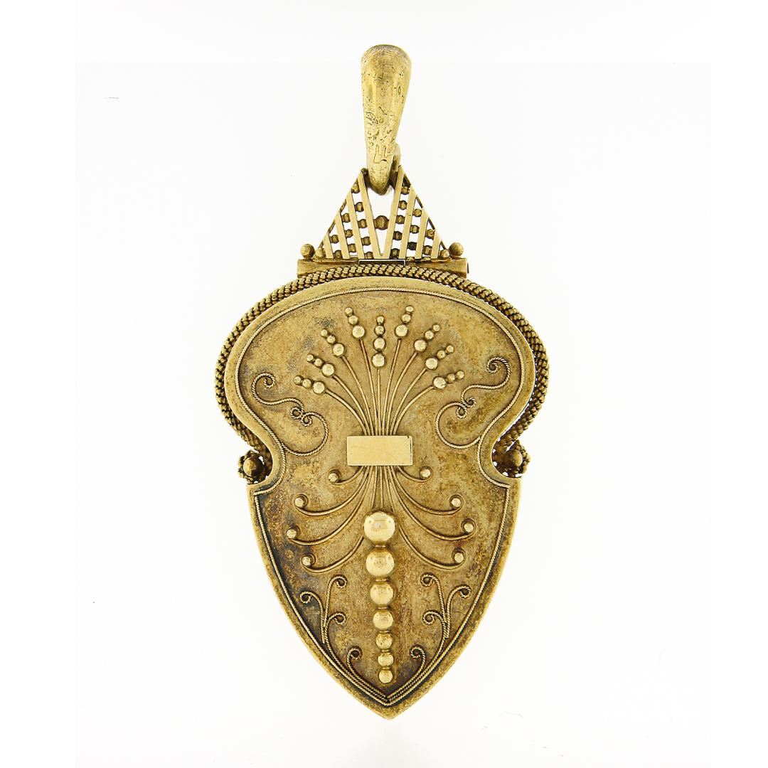 An antique solid 14k yellow gold shield pendant. The pendant weighs a total of 13.43 grams, measures 61.60x31mm including the bail, and the inside of the bail measures ##x##mm.