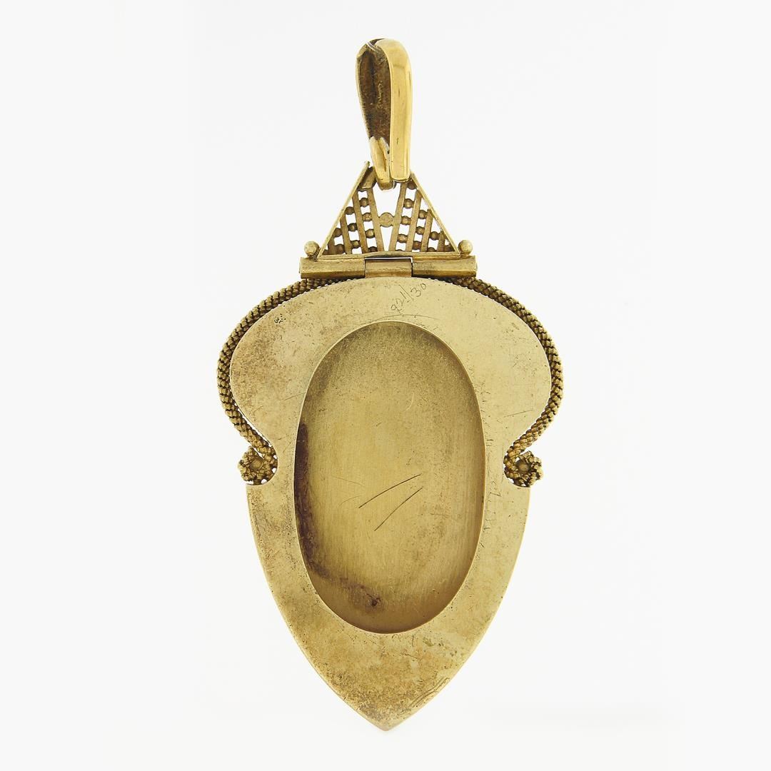 An antique solid 14k yellow gold shield pendant. The pendant weighs a total of 13.43 grams, measures 61.60x31mm including the bail, and the inside of the bail measures ##x##mm.