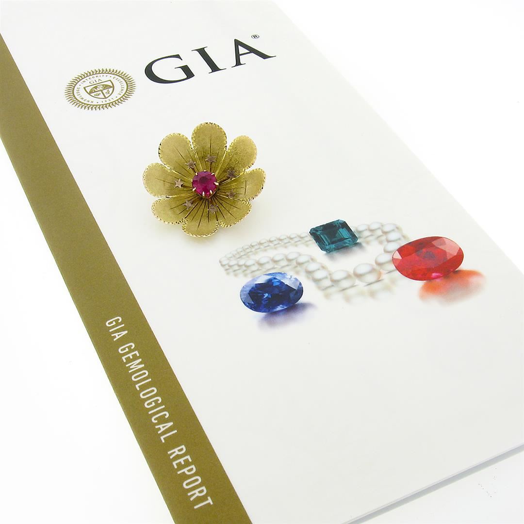 An antique solid 14k yellow gold flower pin brooch, with 1 Gia certified old round cut lab grown ruby (3.44 grams), and Measures 29mm in diameter and weighs a total of 3.44 grams. Comes with all original relevant certifications.