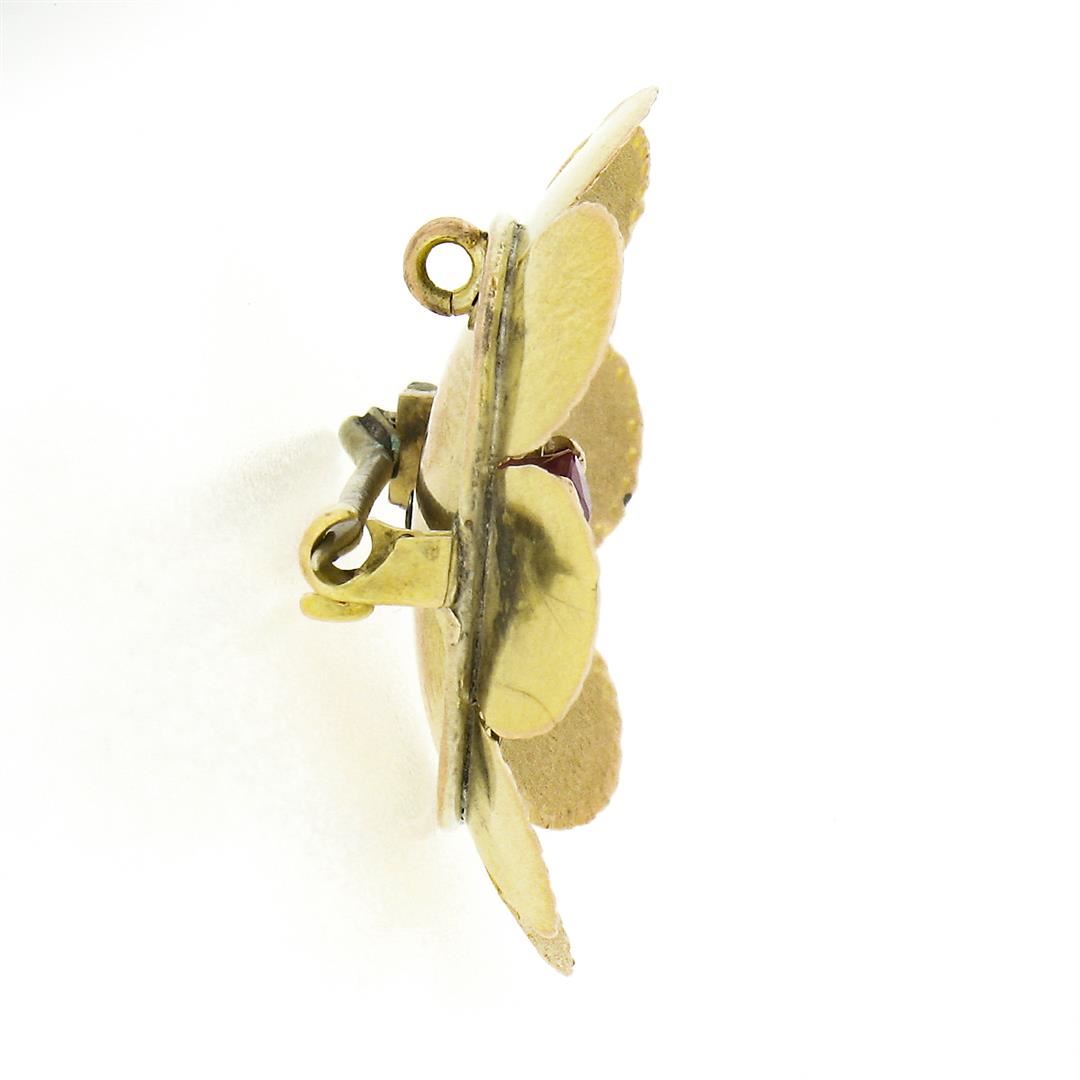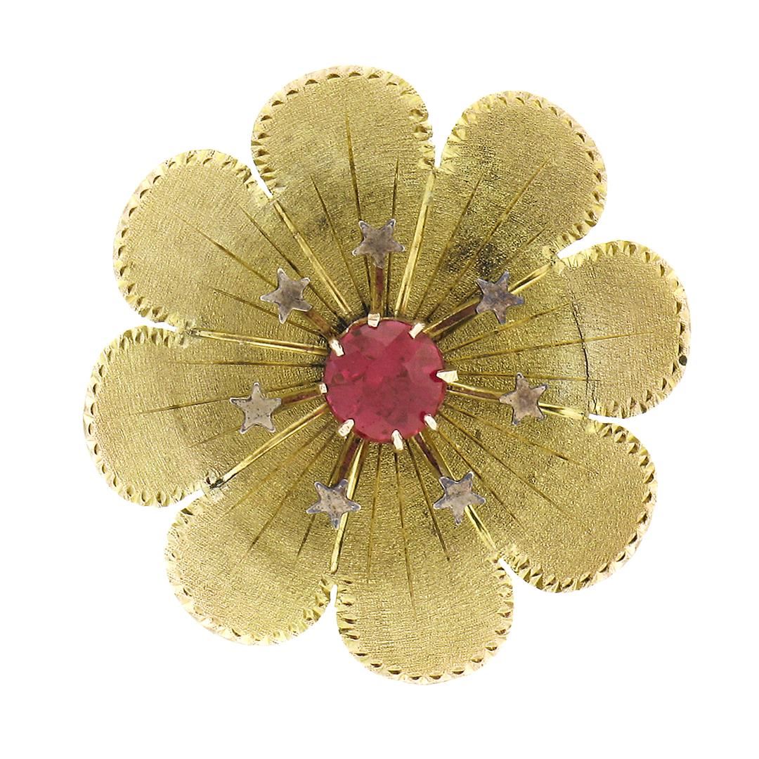 An antique solid 14k yellow gold flower pin brooch, with 1 Gia certified old round cut lab grown ruby (3.44 grams), and Measures 29mm in diameter and weighs a total of 3.44 grams. Comes with all original relevant certifications.