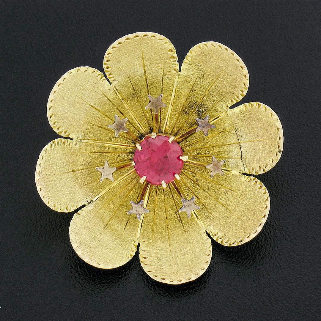 An antique solid 14k yellow gold flower pin brooch, with 1 Gia certified old round cut lab grown ruby (3.44 grams), and Measures 29mm in diameter and weighs a total of 3.44 grams. Comes with all original relevant certifications.
