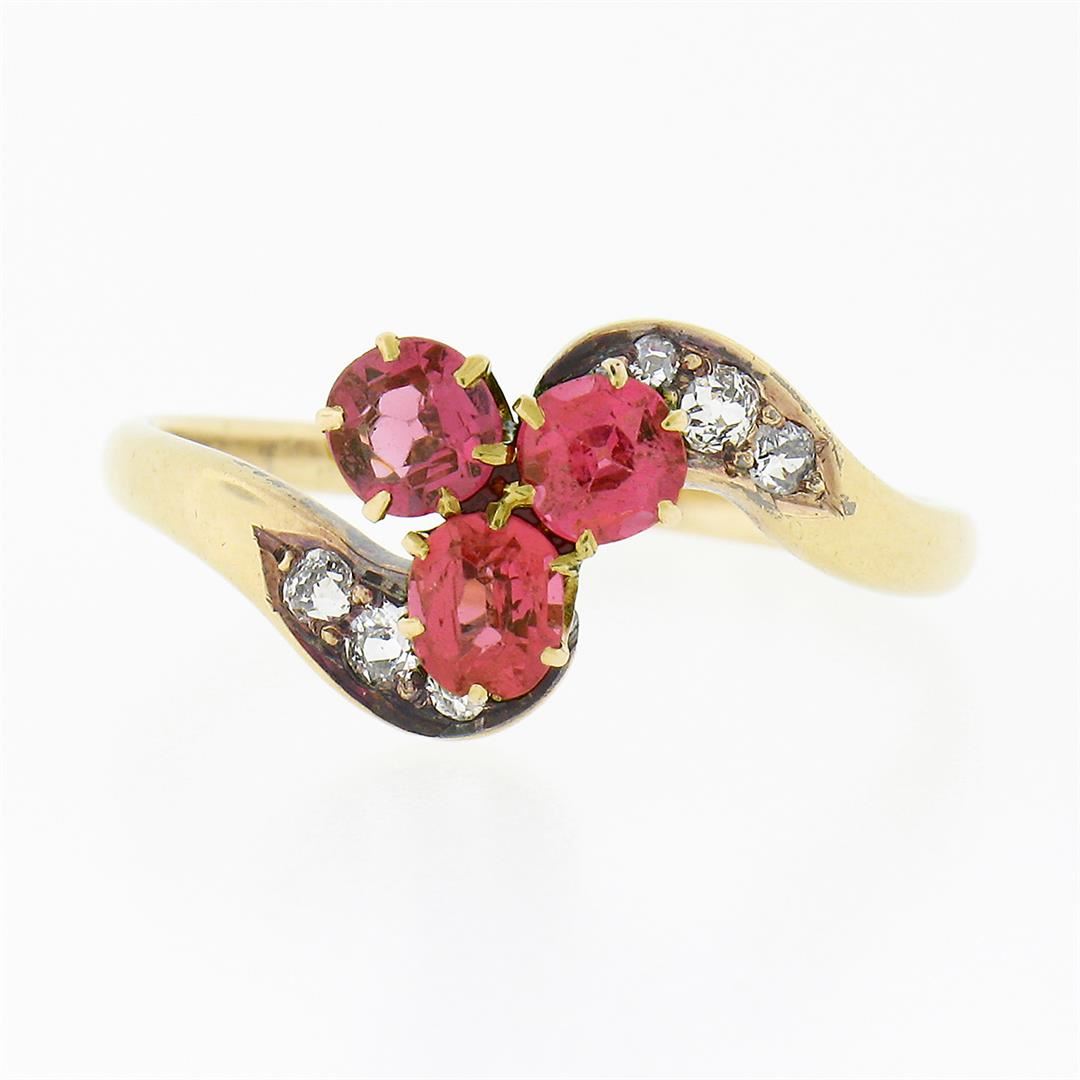 An antique solid 14k yellow gold bypass ring, with Gia certified 3 old mine cut natural spinels (0.90ctw ), and 6 old mine cut natural diamonds (G/H -VS1/VS2 ; 0.14ctw). The ring is size 8.5, weighs a total of 2.54 grams, and measures 11.0mm wide. Comes with all original relevant certifications.