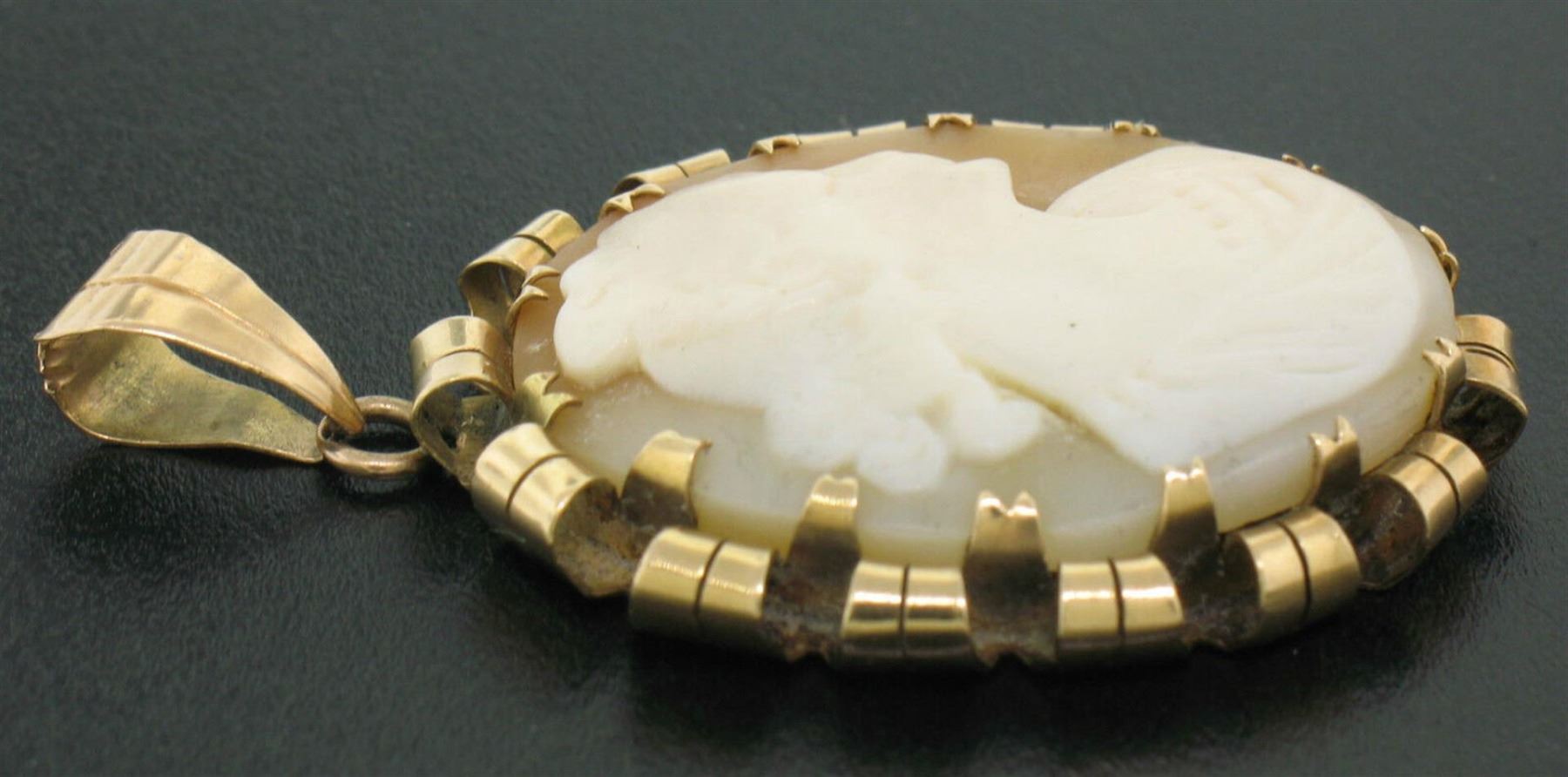 Antique Victorian 14k Gold Hand Carved Shell Oval Cameo Pendant w/ Curled Frame