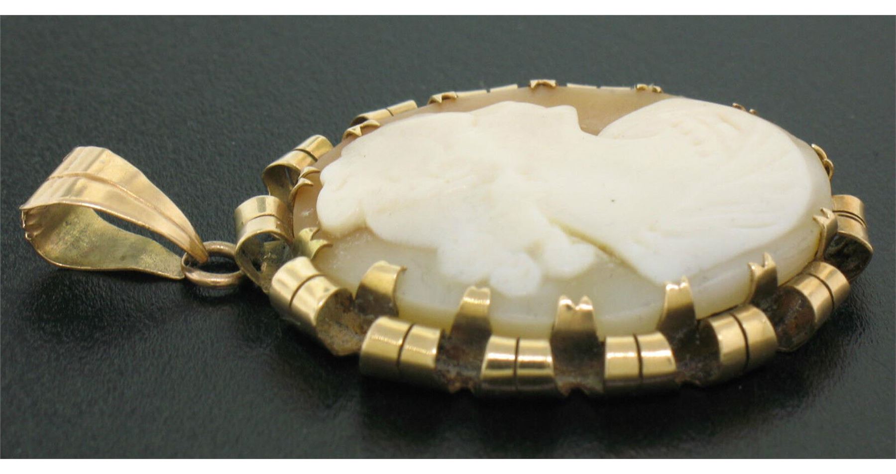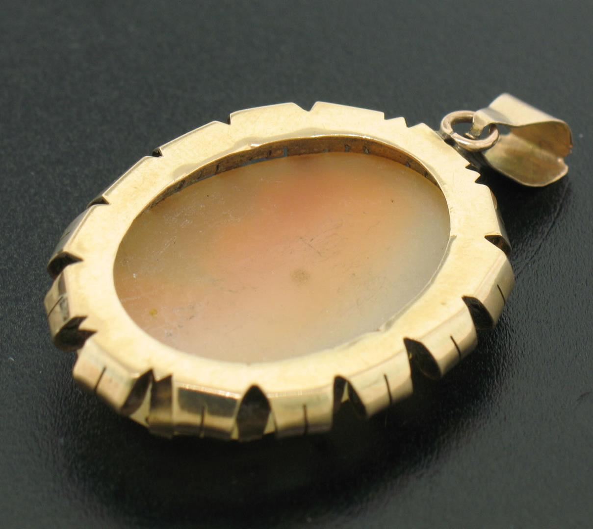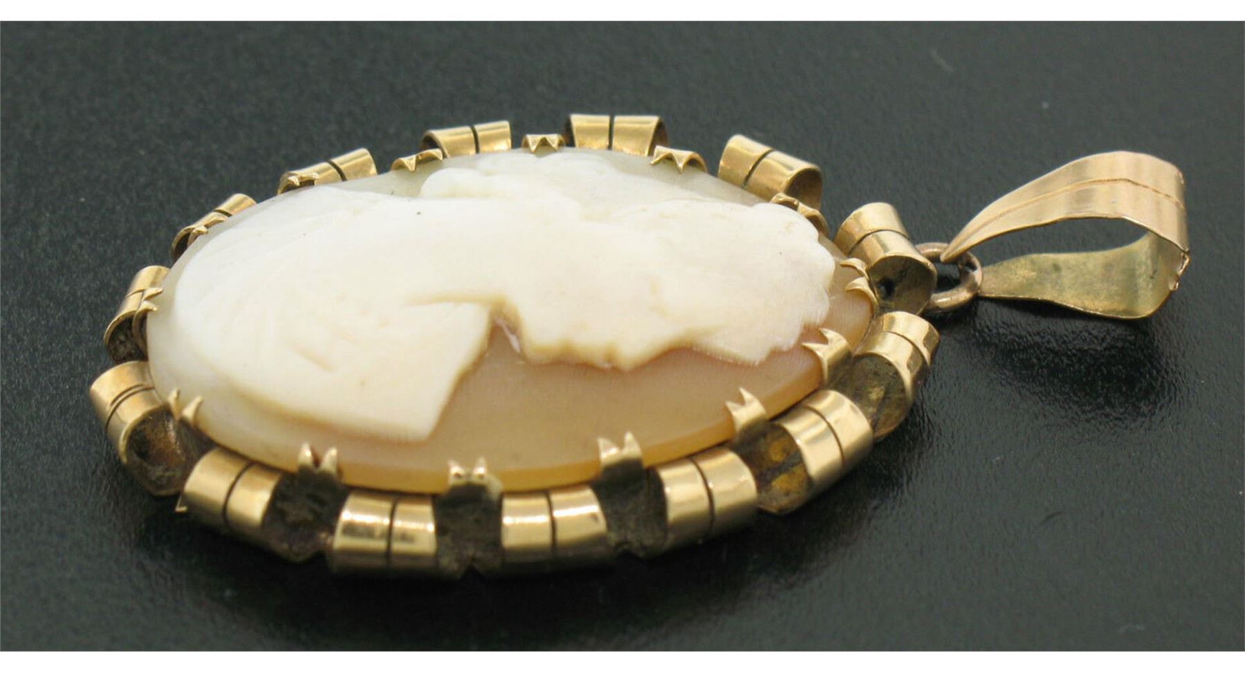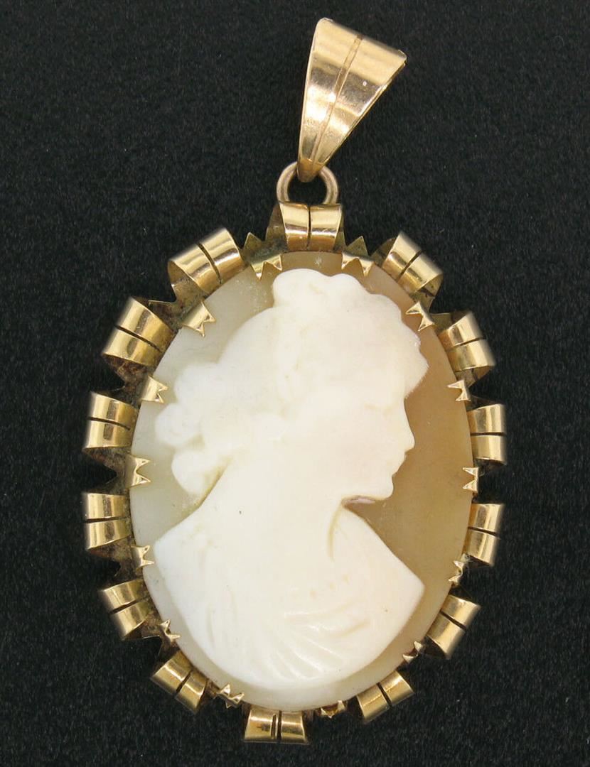 A victorian solid 14k yellow gold cameo pendant, with 1 oval shape carved shell. The pendant weighs a total of 4.70 grams, measures 40.94x24.39mm including the bail.