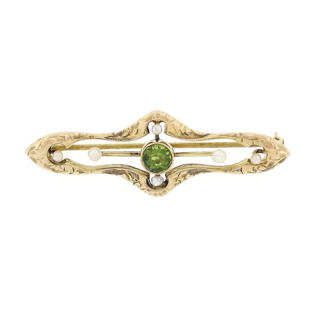 An antique victorian solid 14k rosy yellow gold bar pin brooch, with 1 old round cut natural peridot (4.50mm ), and 6 round shape natural seed pearls (1.7mm to 2.3mm). Measures 13.9x41mm and weighs a total of 2.37 grams.