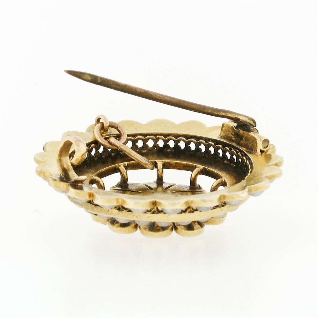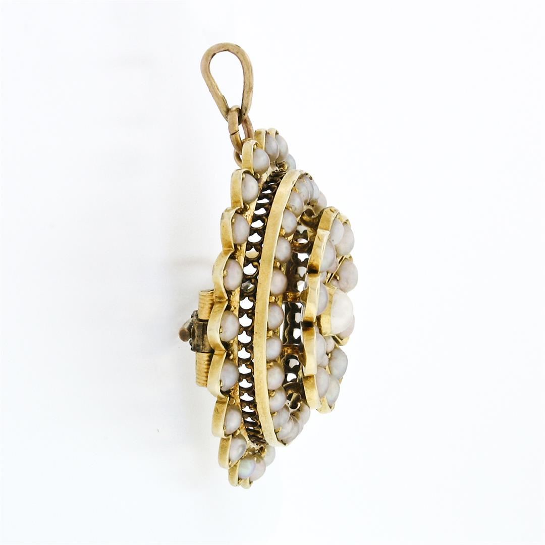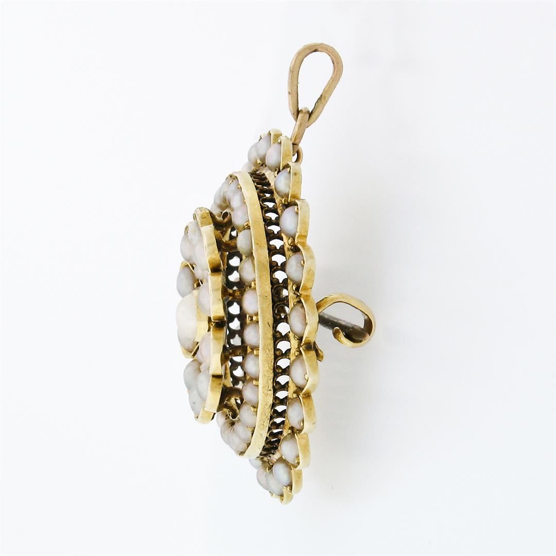 An antique victorian solid 14k yellow gold flower pendant pin brooch, with 1 half round shape natural pearl (3.80mm), and 66 half rounf shape natural seed pearls (1.85 - 2.85mm). Measures 38.57x31.20mm and weighs a total of 9.81 grams.