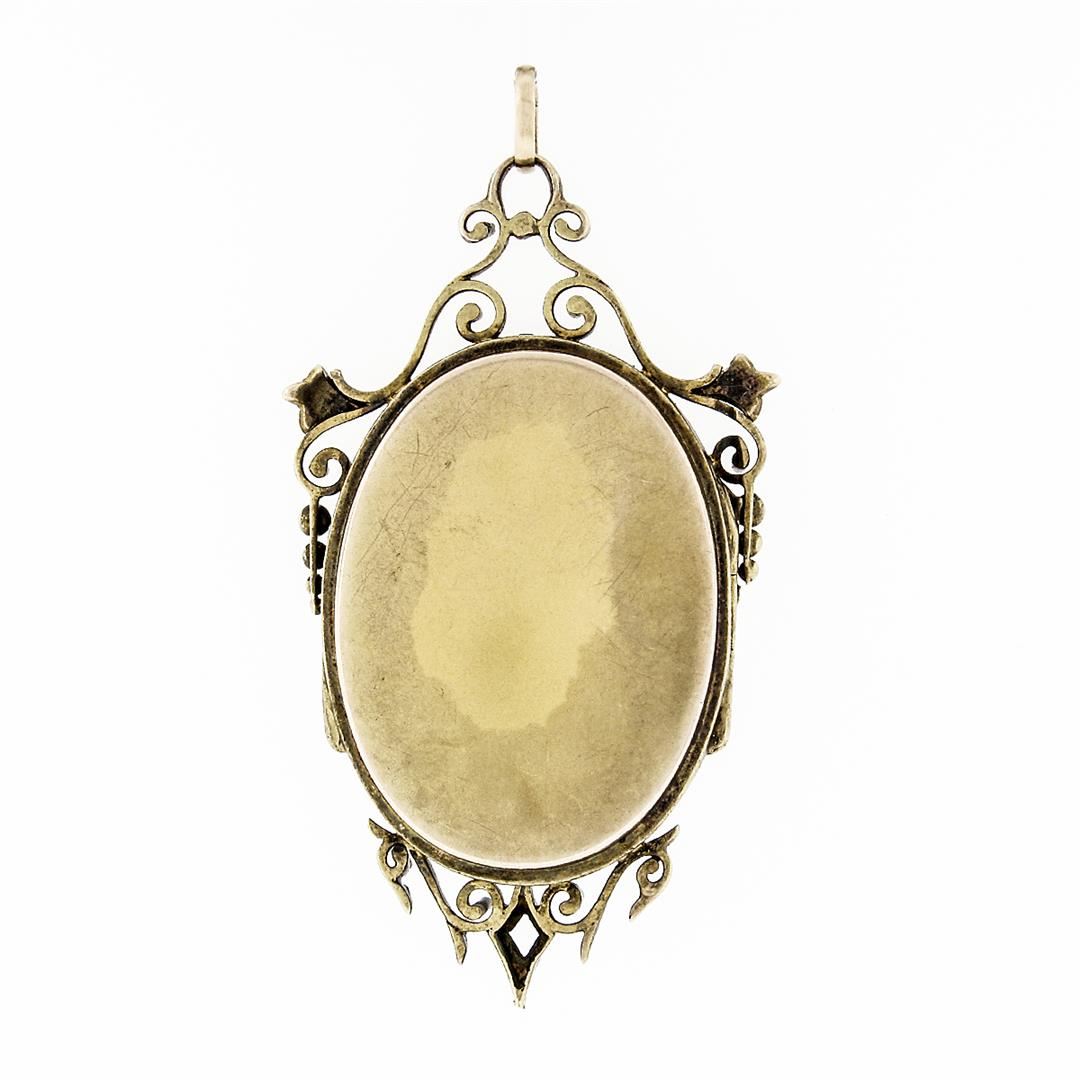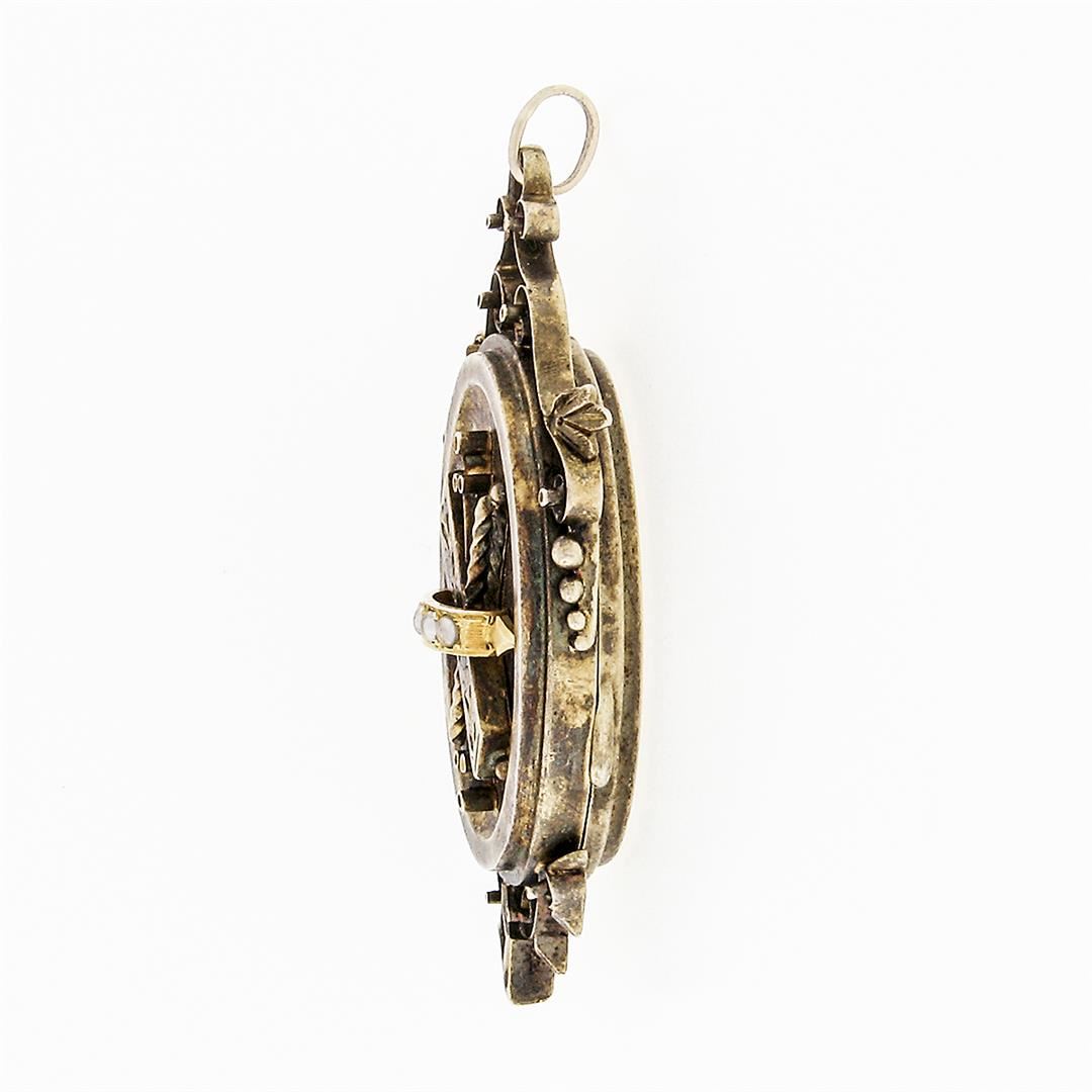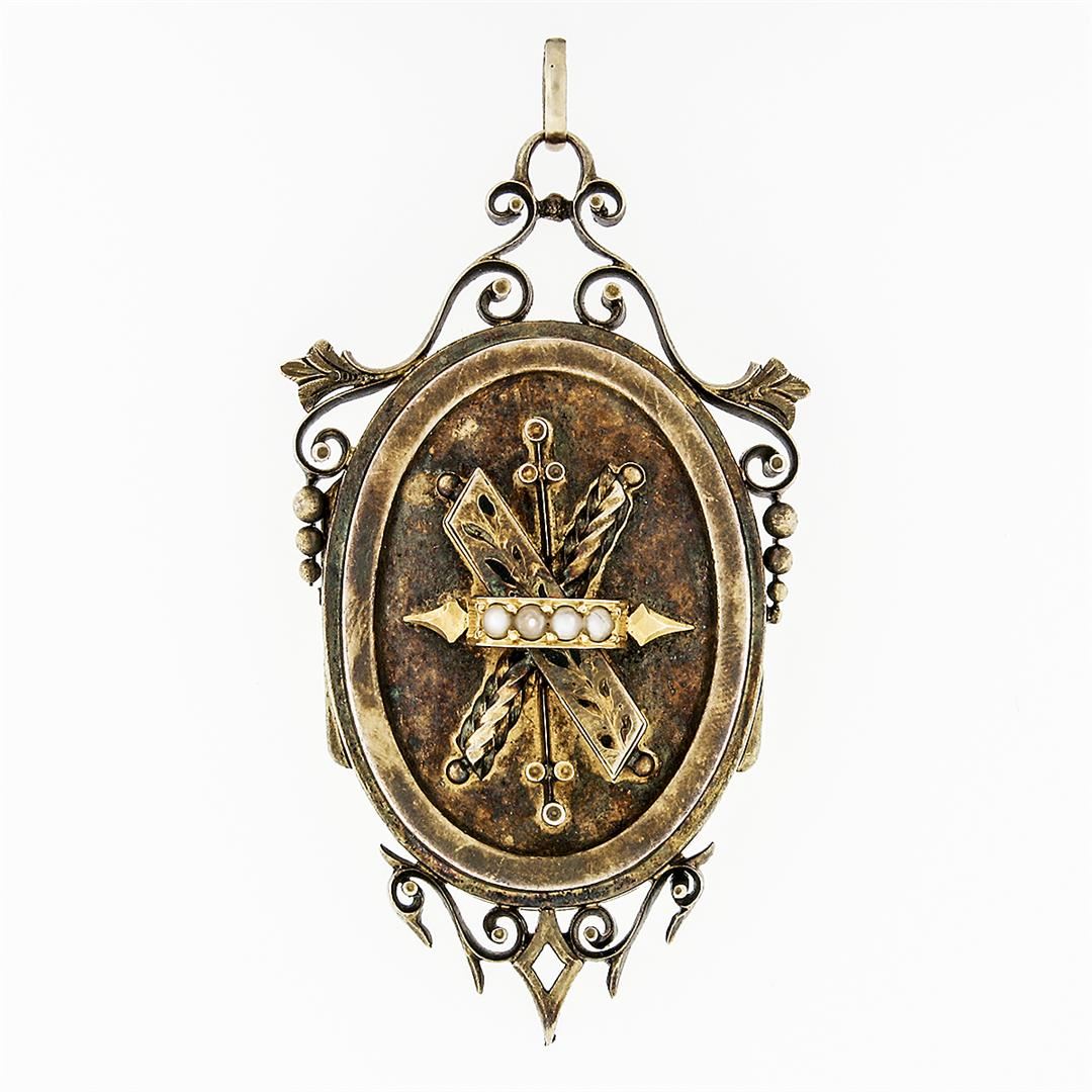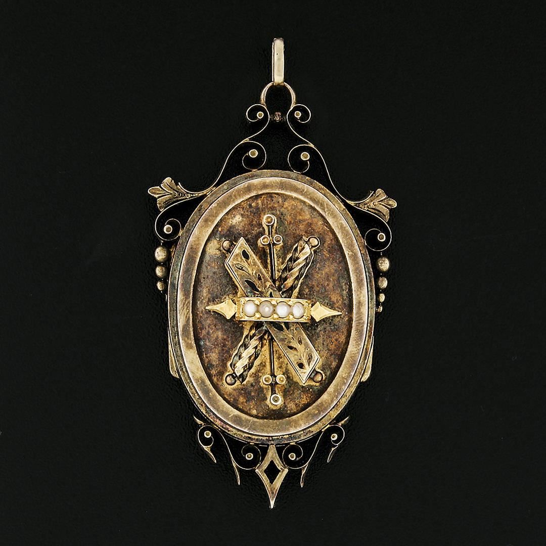An antique solid 14k yellow gold enamel work locket pendant. with 3 round shape natural seed pearls ( 2.0mm). The pendant weighs a total of 14.30 grams, measures 57.26x30.29mm including the bail, and the inside of the bail measures ##x##mm.