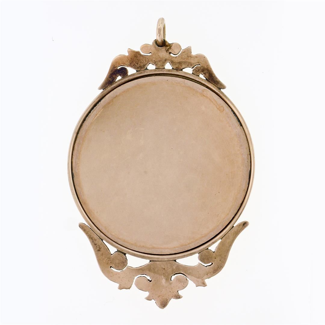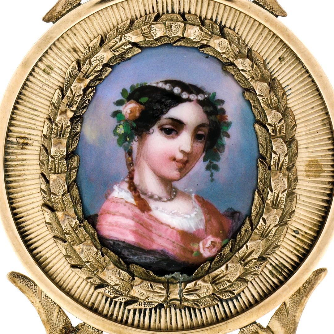 An antique solid 14k yellow gold hand painted portrait pendant. The pendant weighs a total of 9.39 grams, measures 49.15x31.75mm including the bail, and the inside of the bail measures 2.50mm in diameter.