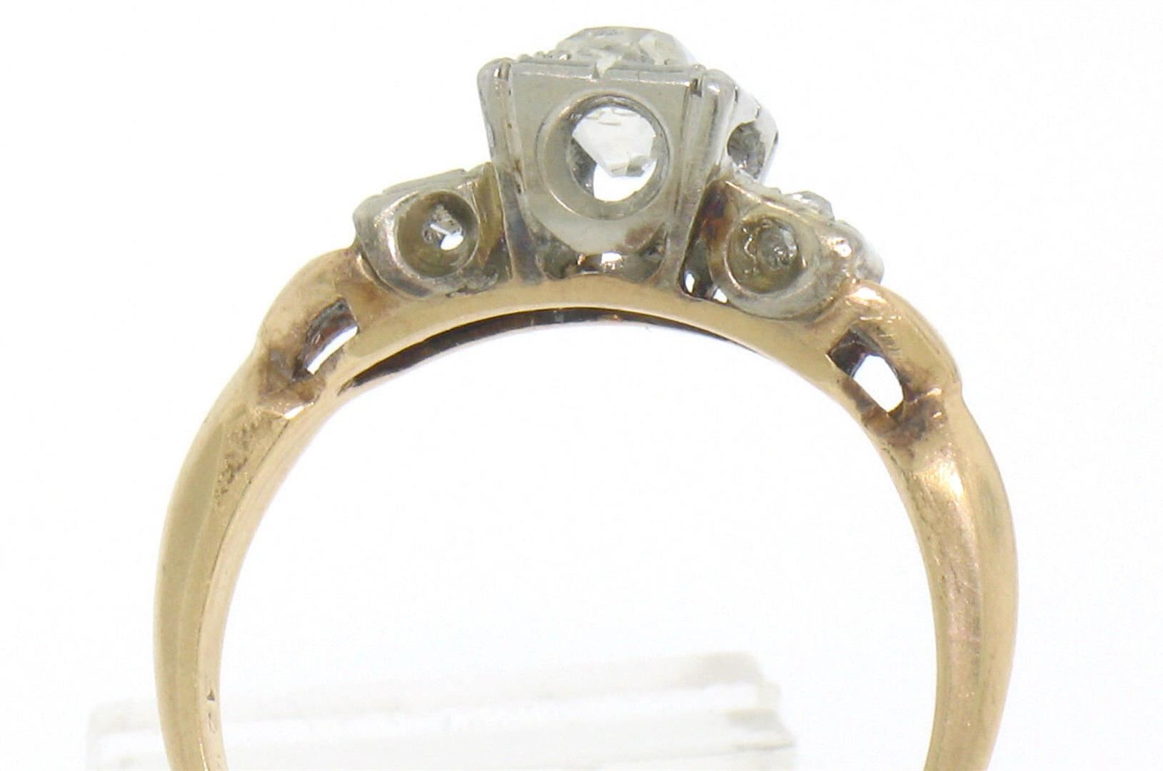 An antique victorian solid 14k white and yellow gold 3 stones ring, featuring 3 cushion old cut natural diamonds (H/I - VS2; 0.40ctw). The ring is size 5.5, weighs a total of 2.3 grams, and measures 5.88mm wide.