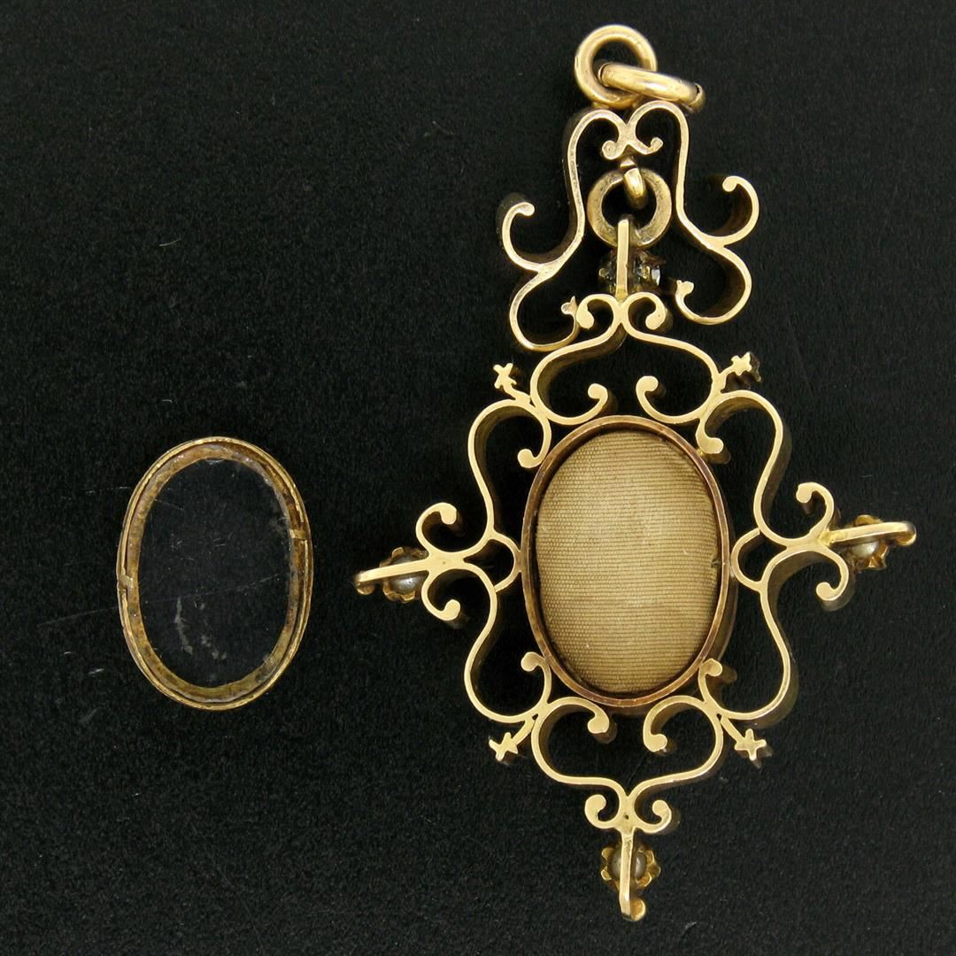 An excellent condition antique 14k yellow gold locket pendant with a oval carved white and black stone cameo, 2.6mm seed pearls, and a 0.20ct old mine cut diamond (I - VS2). The pendant weighs a total of 16.2 grams and measures 65.2x37.5mm.