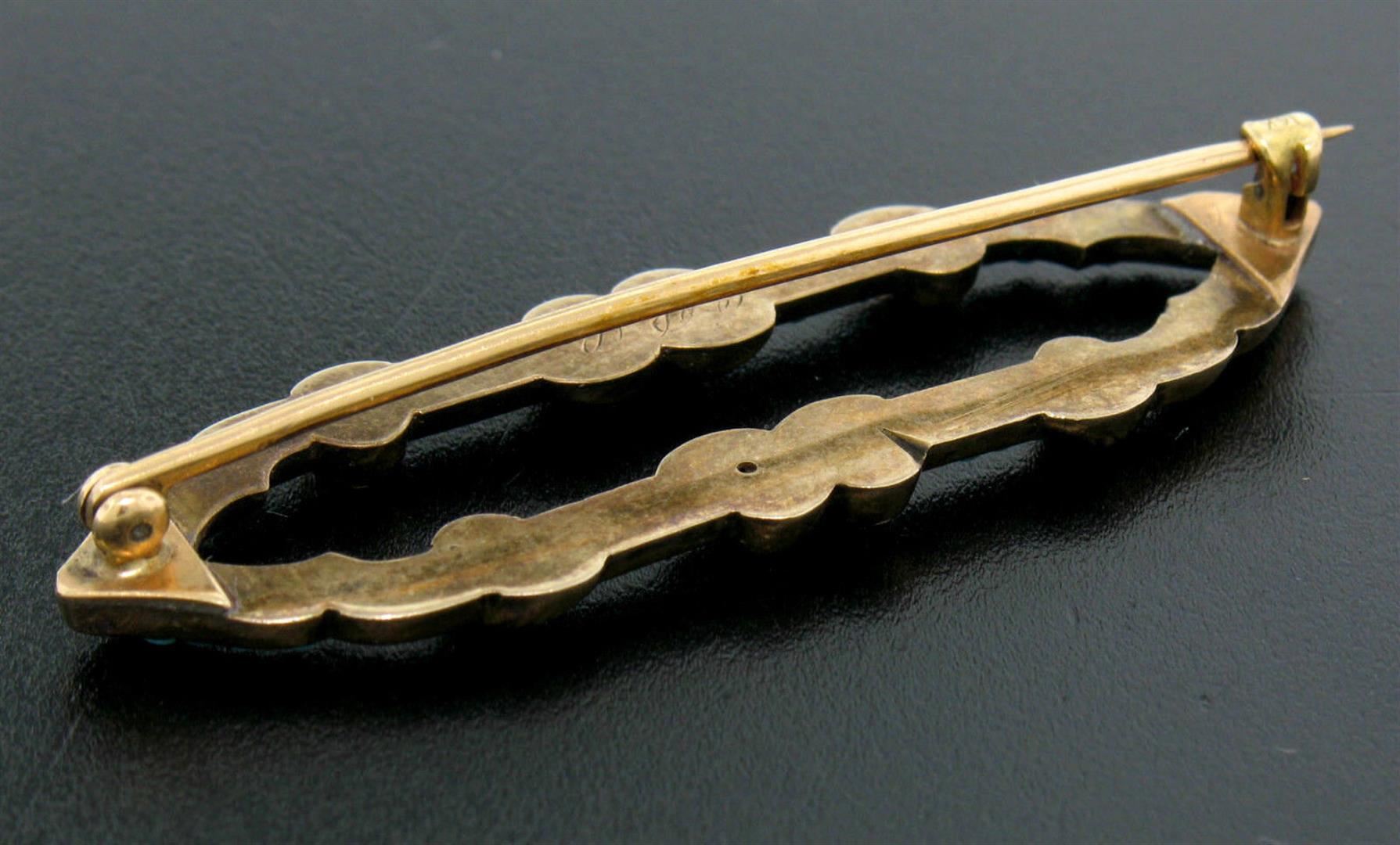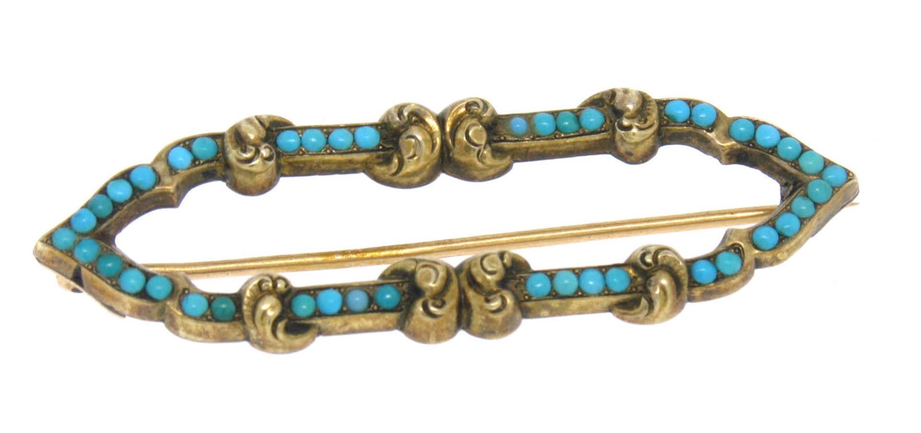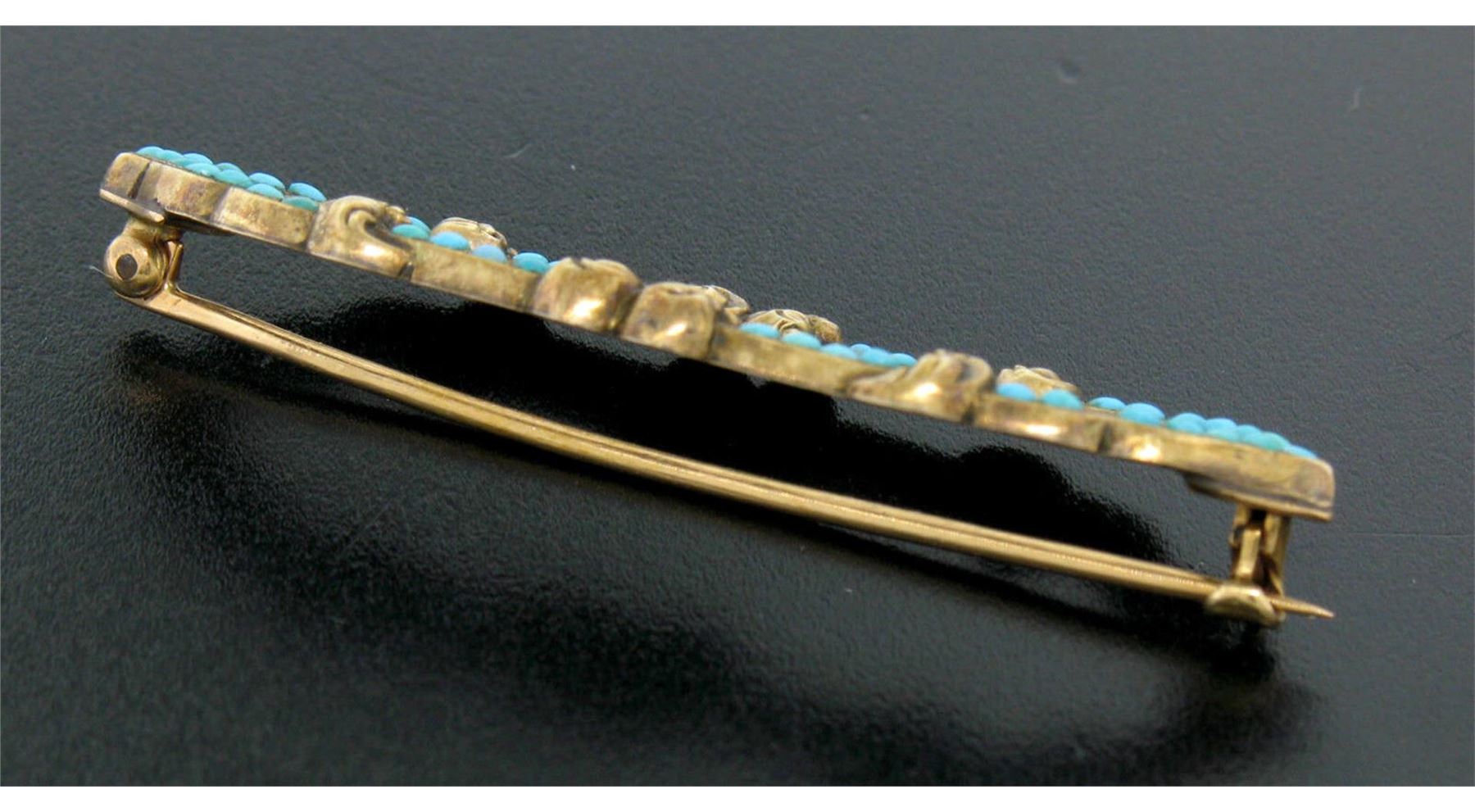 An antique victorian solid 14k yellow gold pin brrooch, with 42 round natural persian turquoise. Measures 17.80x55.18mm and weighs a total of 7.0 grams.
