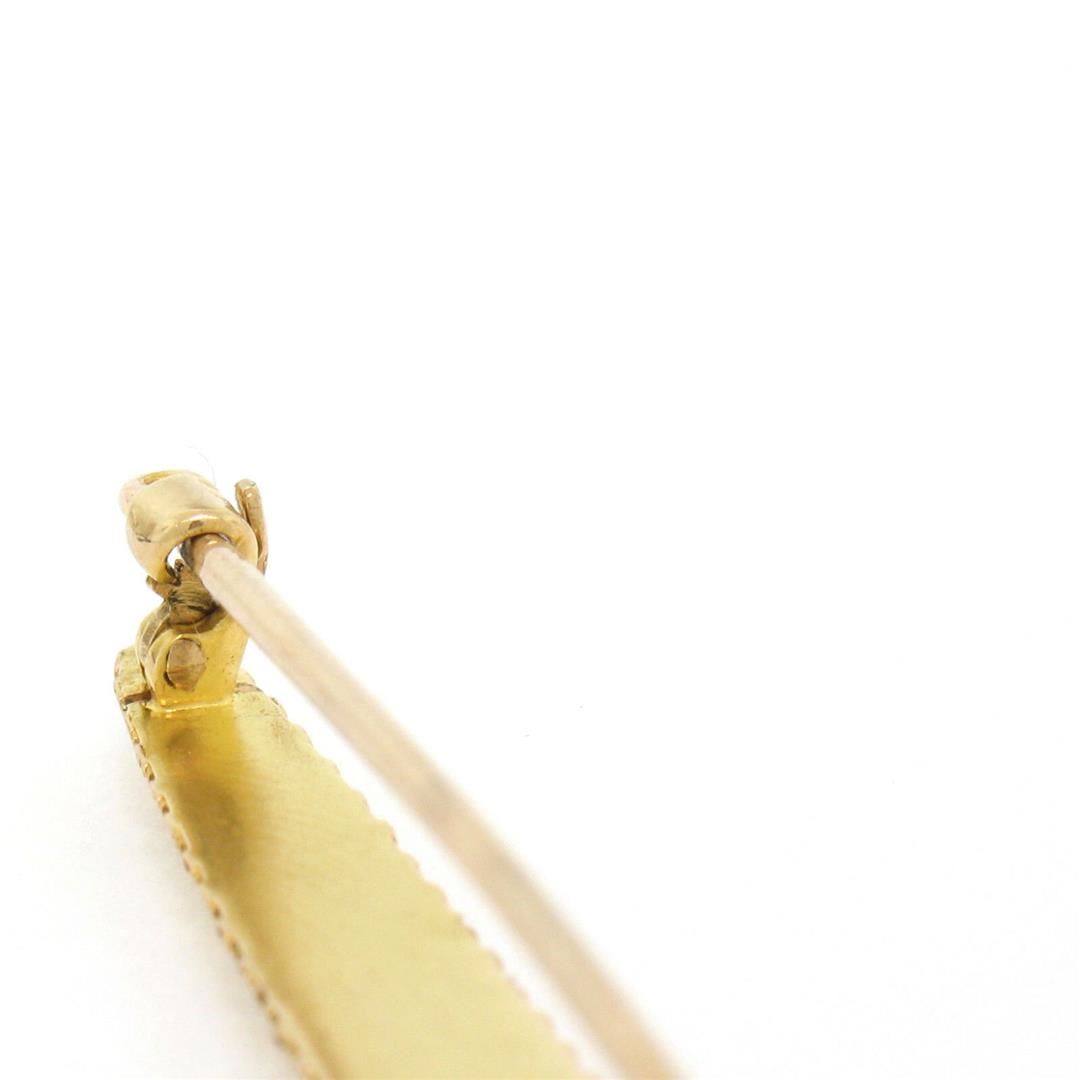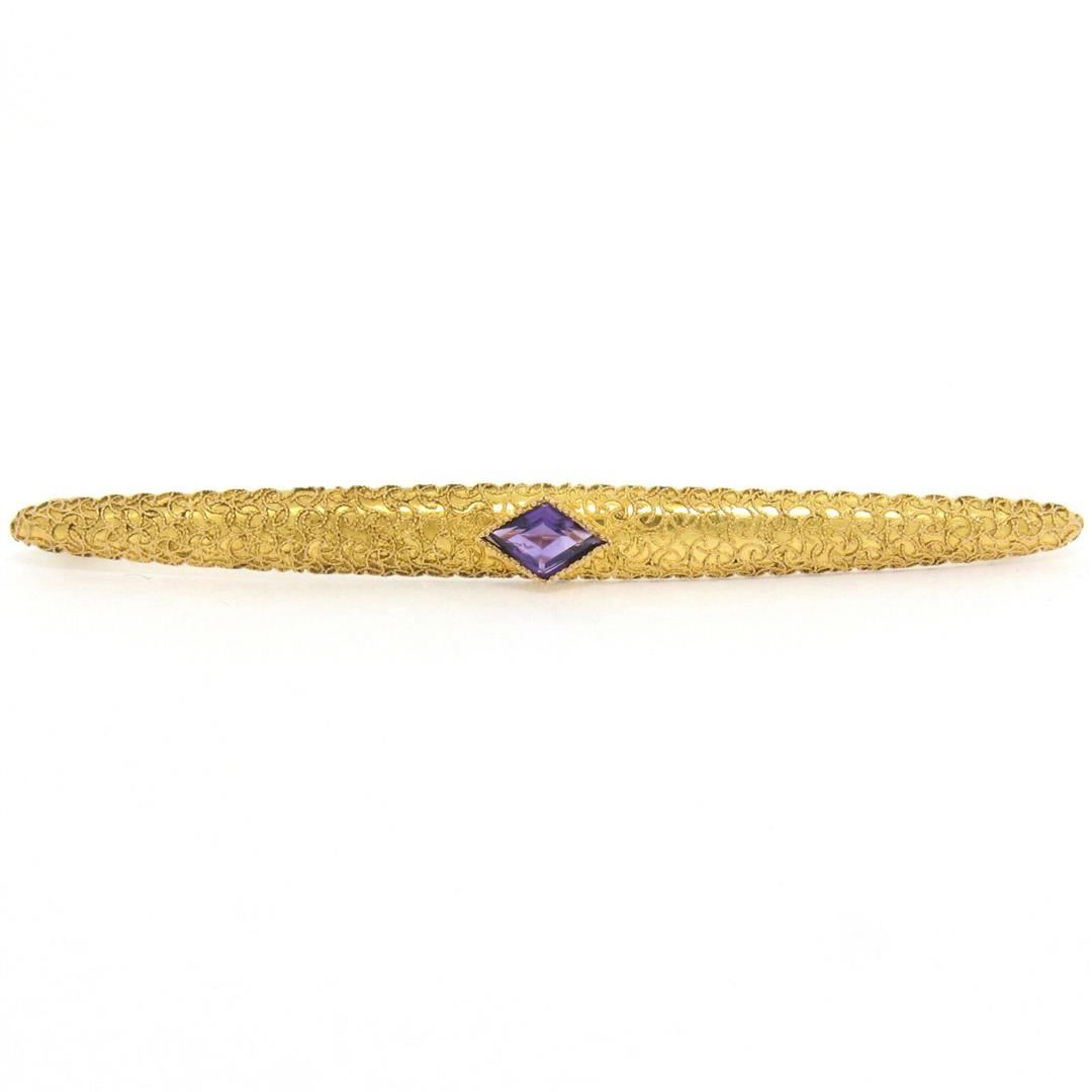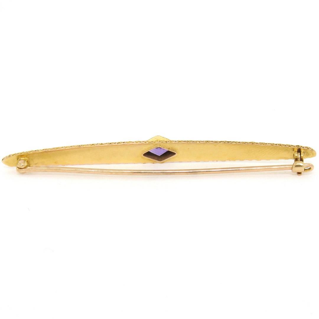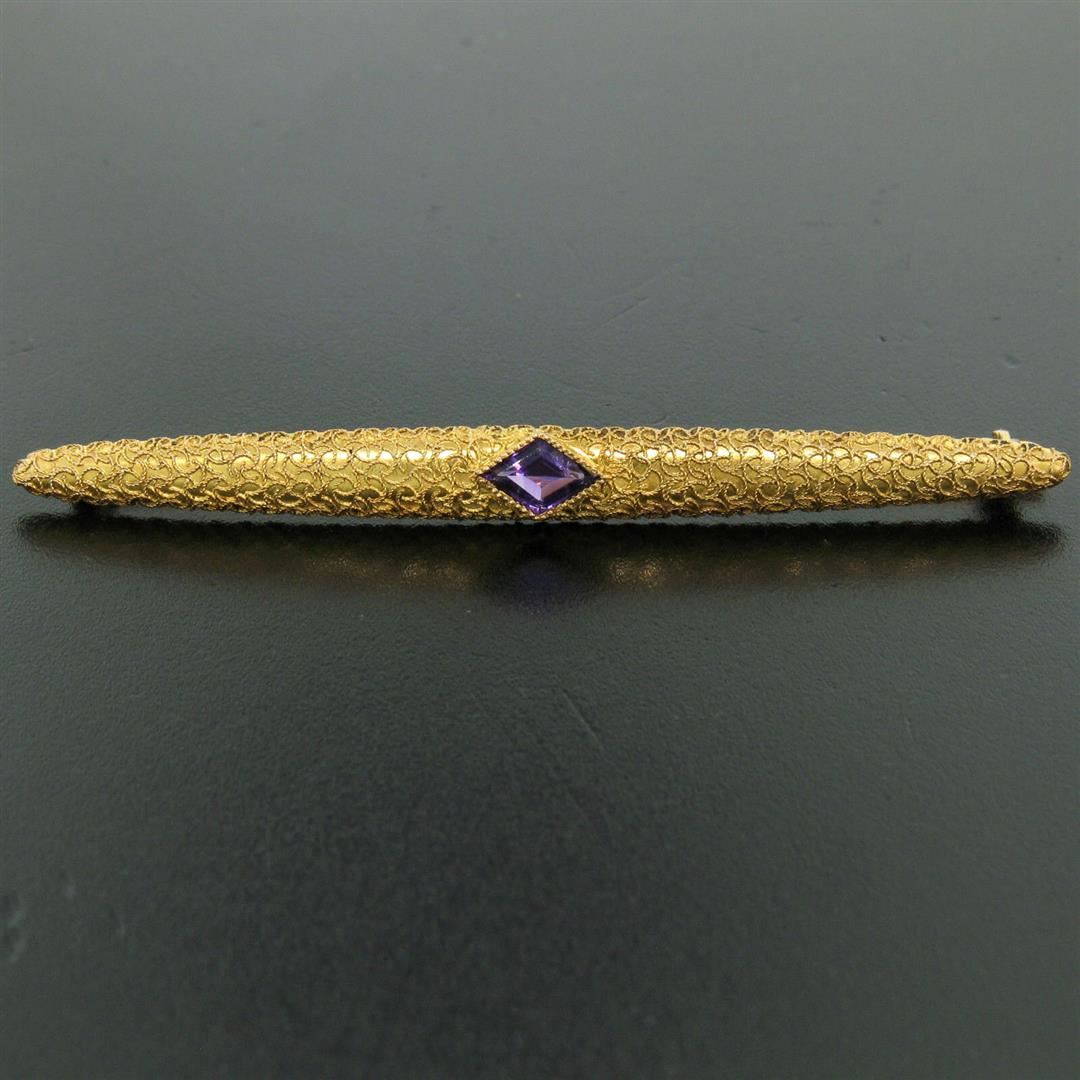 An antique Victorian era 14kt yellow gold bar pin featuring a 0.60ct lozenge step cut amethyst bezel set at its center. Measures 68.30x6.27mm and weighs a total of 3.97 grams.