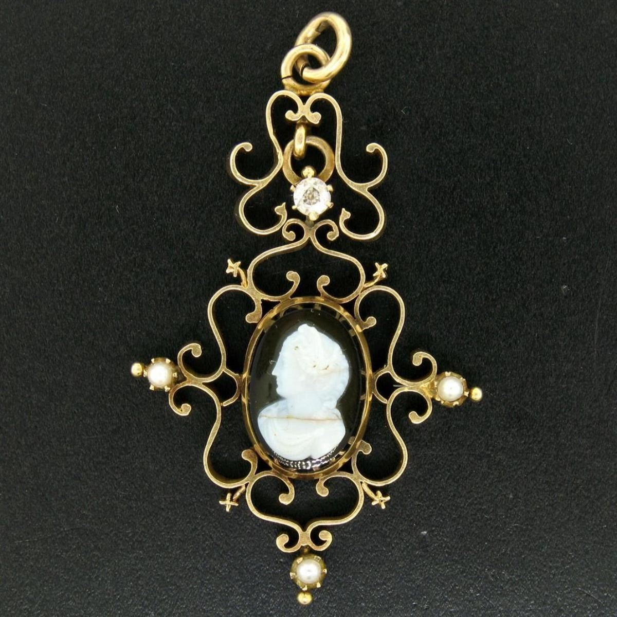 An excellent condition antique 14kt yellow gold locket pendant with a oval carved white and black stone cameo, 2.6mm seed pearls, and a 0.20ct old mine cut diamond (I - VS2). The pendant weighs a total of 16.2 grams and measures 65.2x37.5mm.