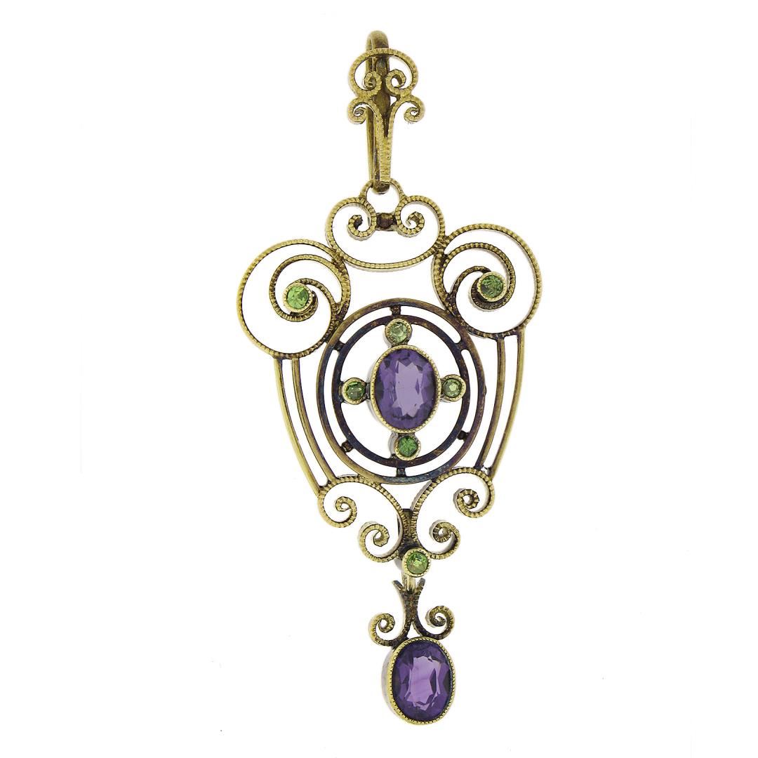 An antique solid 15k yellow gold lavalier pendant, with 2 oval cut natural amethysts (5.7x4mm & 5.5x3.8mm), and 7 round cut demantoid garnets (0.10-0.15ctw). The pendant weighs a total of 4.77 grams, measures 49.2x22.3mm including the bail, and the inside of the bail measures 9.7x3mm.
