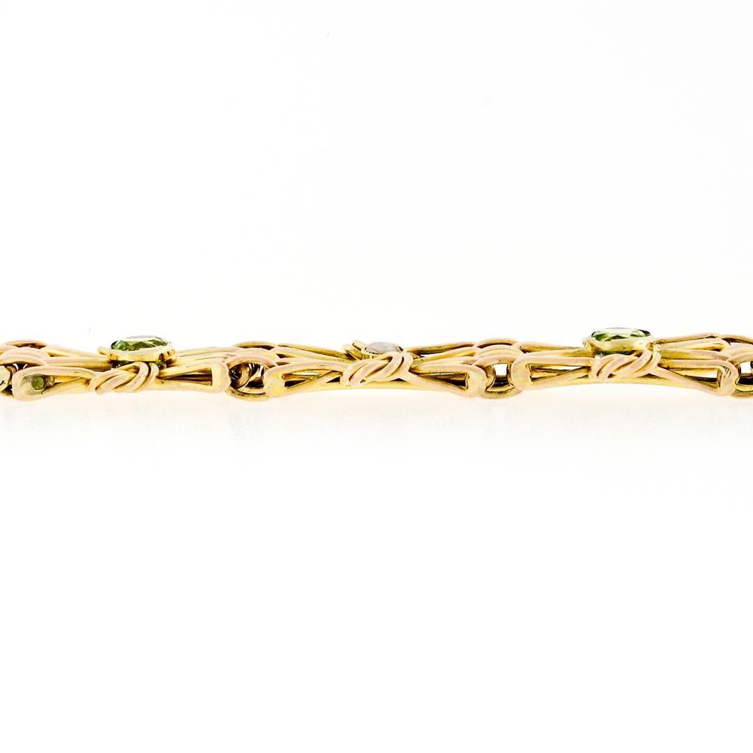 An antique victorian solid 15k yellow gold knot link bracelet, with 5 round cut natural peridots (2.5ctw ), & 4 round shape cultured pearls (3mm). It weighs a total of 15.58 grams, measures 11mm wide, and measures 6 inches in length.