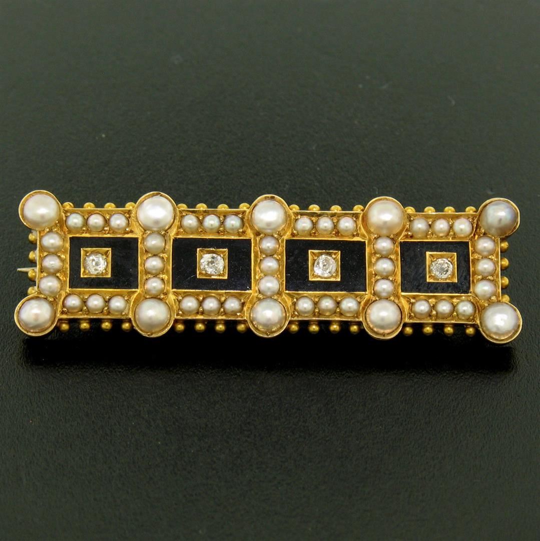 An antique solid 15k yellow gold bar pin brooch, featuring 49 round shape natural seed pearls (1.7-3.2mm), 3 old mine cut natural diamonds (F/G- VS1/VS2 ; 0.24ctw),and 4 rectangular shape natural black onyx (7.05x4.84mm). Measures 13.37x44.43mm and weighs a total of 8.35 grams.