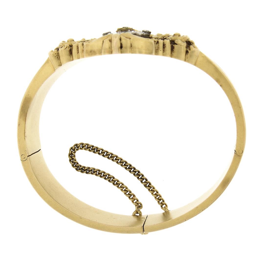An antique solid 18k yellow gold bangle barcelet, with enamel work, 14 old single & rose cut natural diamonds (G-I - VS2-SI2 ; 0.31ctw), and 4 square step cut natural rubies (0.18ctw). It weighs a total of 72.71 grams, measures 44.3mm wide, and measures 7.25 inches in length.