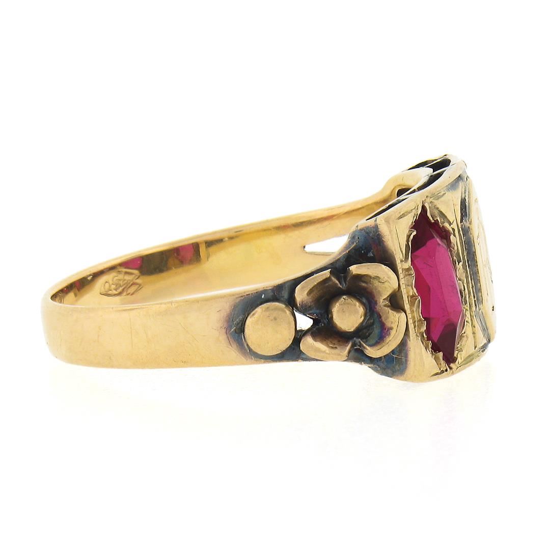 An antique solid 18k rosy yellow gold signet ring, with 2 lozenge kite cut synthetic red stones (8.1x4.5mm & 7.4x4.1mm). The ring is size 10.0, weighs a total of 4.34 grams, and measures 9.9mm wide.