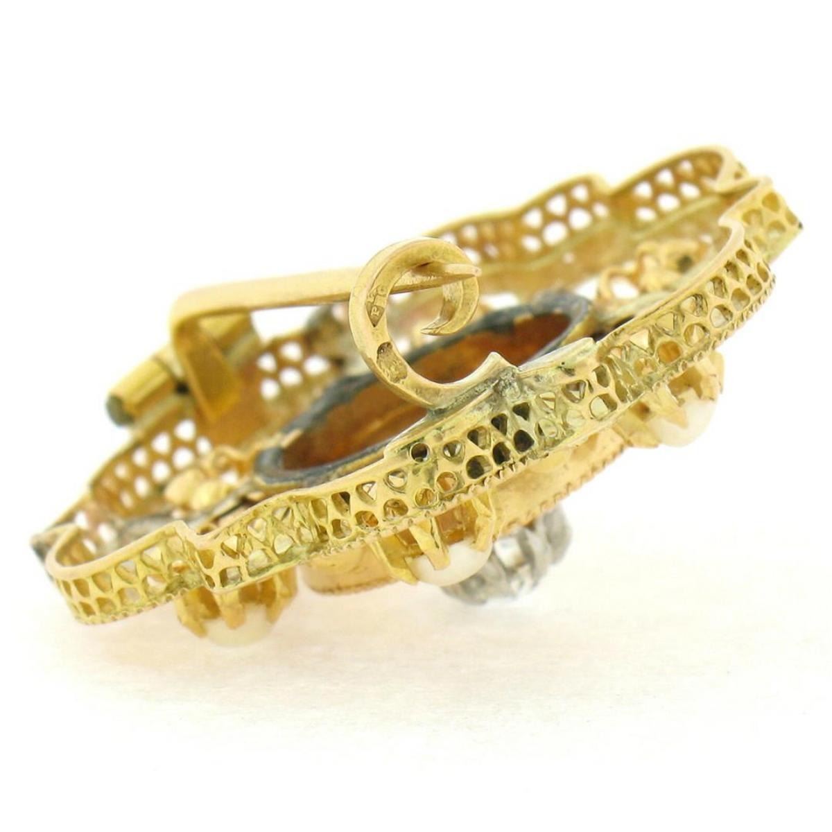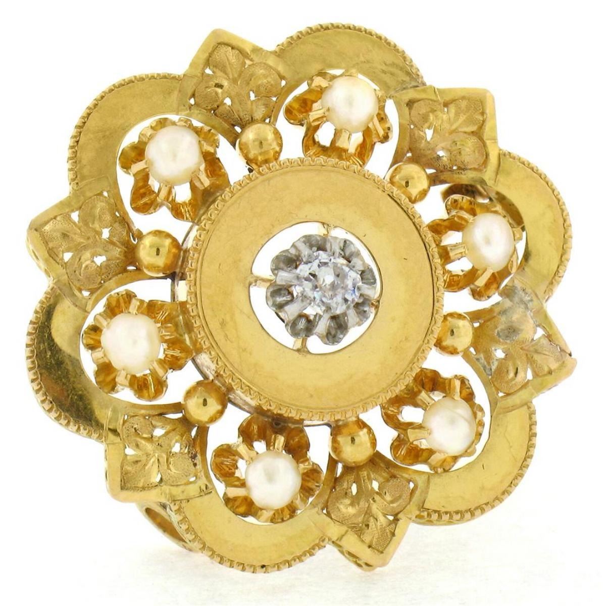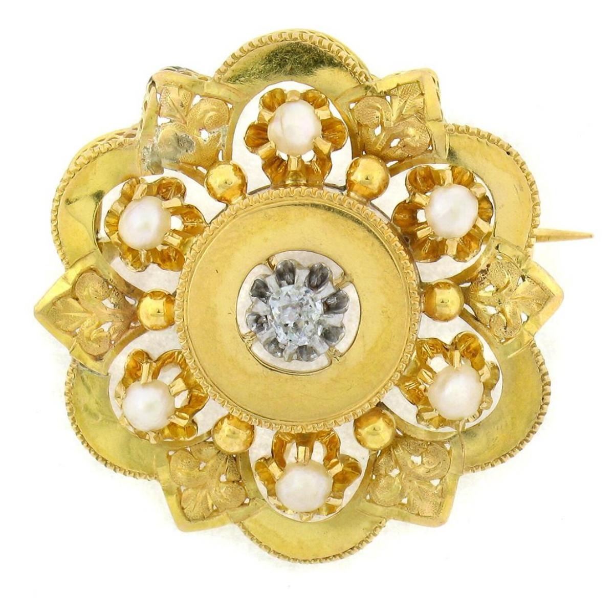 Antique Victorian 18K Yellow Gold Diamond Pearl Detailed Open Flower Brooch Pin