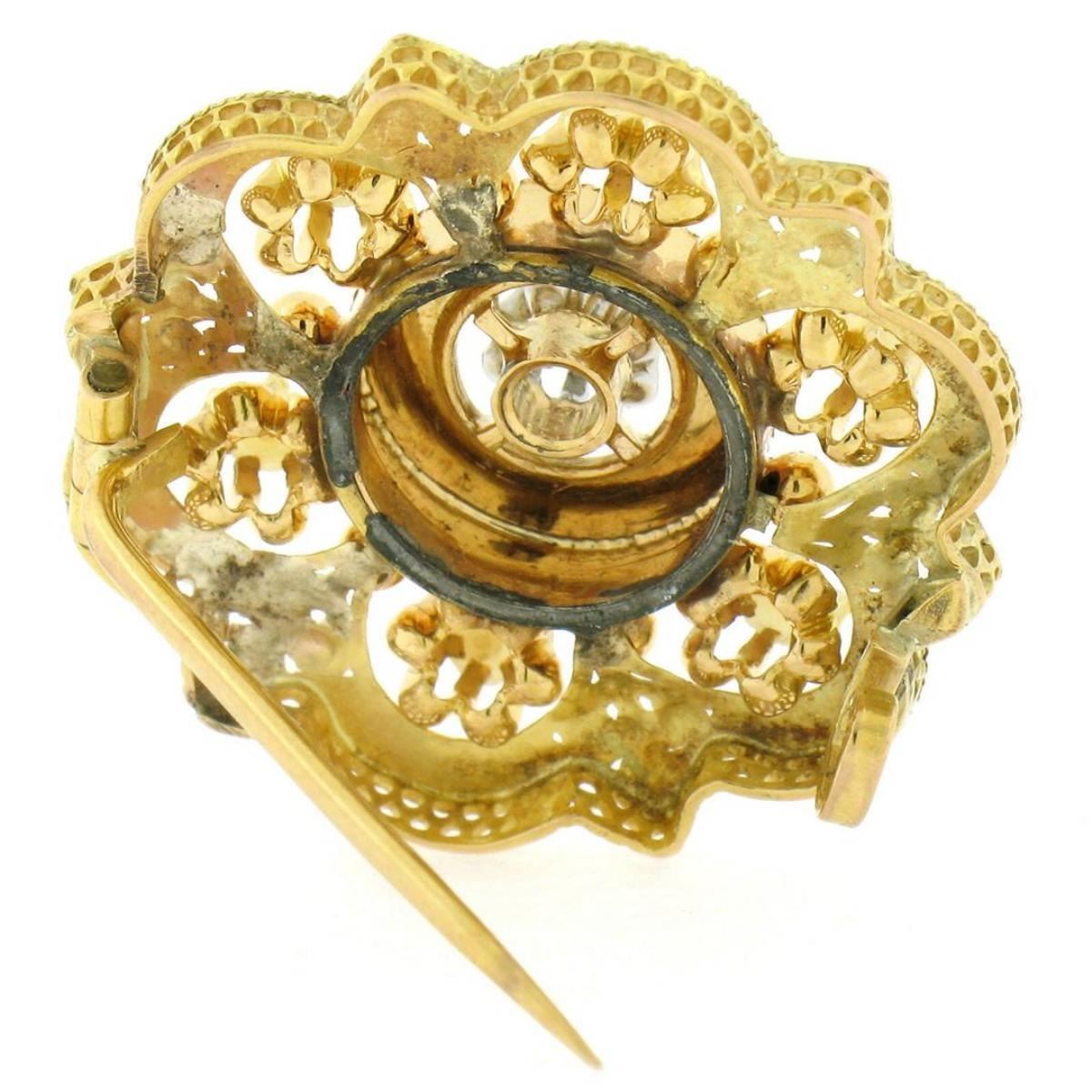 An antique solid 18k yellow gold Victorian era flower brooch featuring an old mine cut diamond (H - VS2; 0.12ct) prong set at its center surrounded by 6 individually prong set natural pearls (2.85mm). Measures 26.75mm in diameter and weighs a total of 5.19 grams.