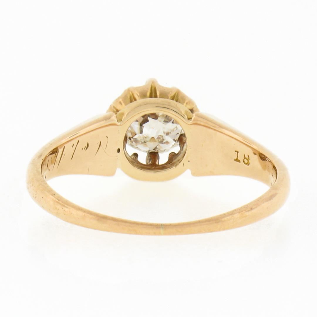 An antique solid 18k yellow gold engagement ring, with 1 old mine cut natural diamond (I - VS2 ; 0.65ct). The ring is size 5.5, weighs a total of 2.83 grams, and measures 7.15mm wide.