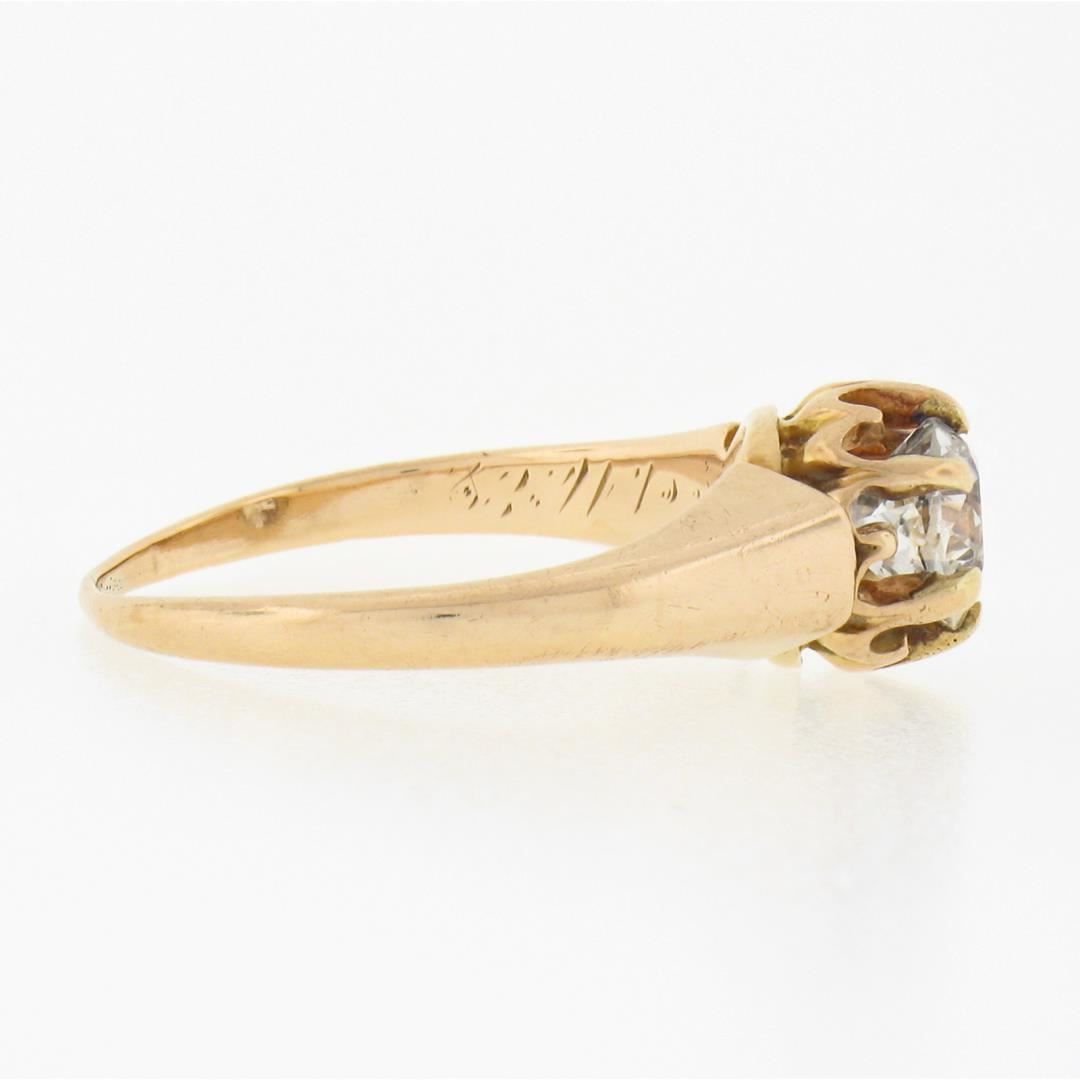 An antique solid 18k yellow gold engagement ring, with 1 old mine cut natural diamond (I - VS2 ; 0.65ct). The ring is size 5.5, weighs a total of 2.83 grams, and measures 7.15mm wide.