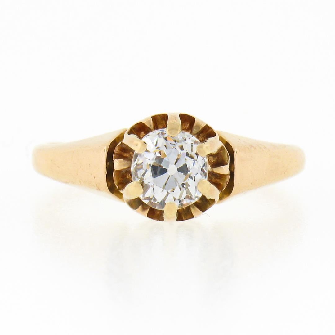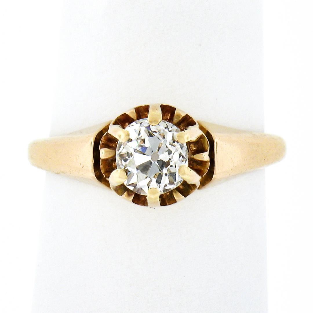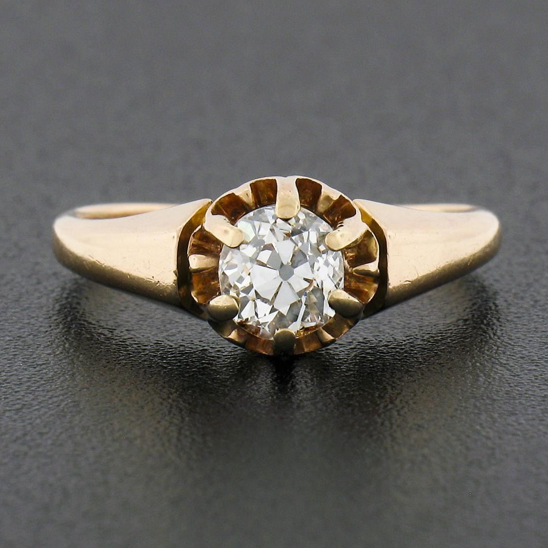 An antique solid 18k yellow gold engagement ring, with 1 old mine cut natural diamond (I - VS2 ; 0.65ct). The ring is size 5.5, weighs a total of 2.83 grams, and measures 7.15mm wide.