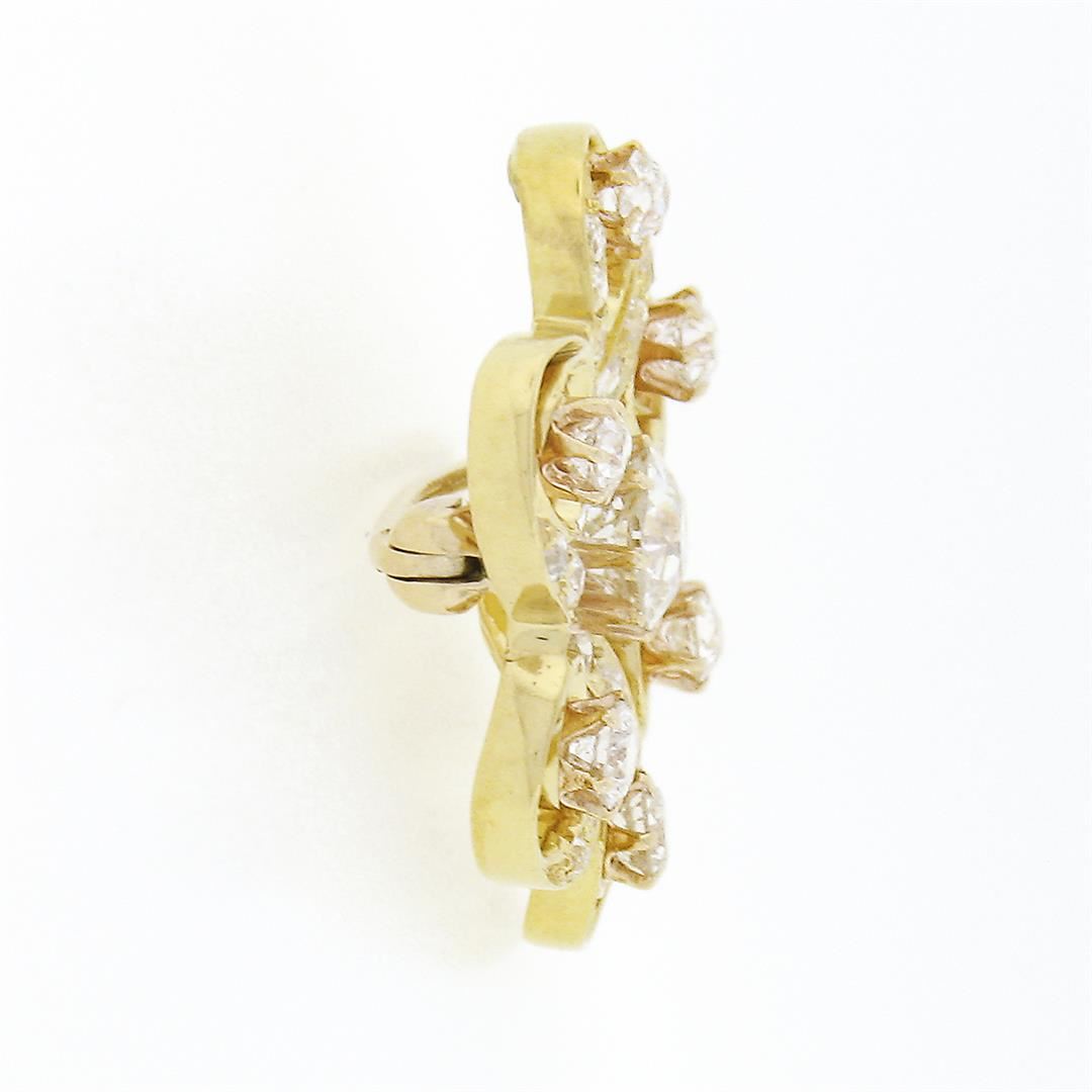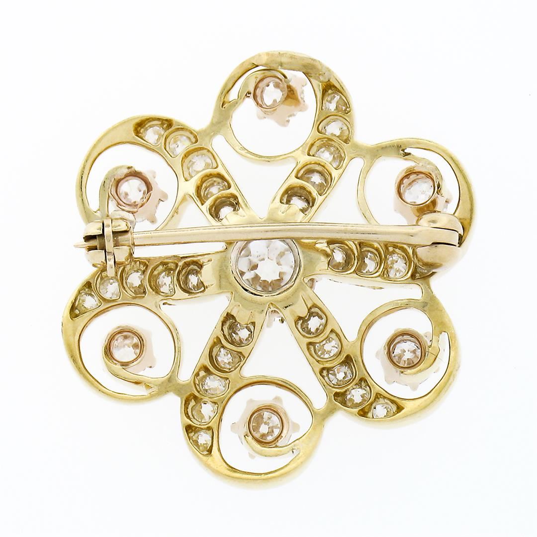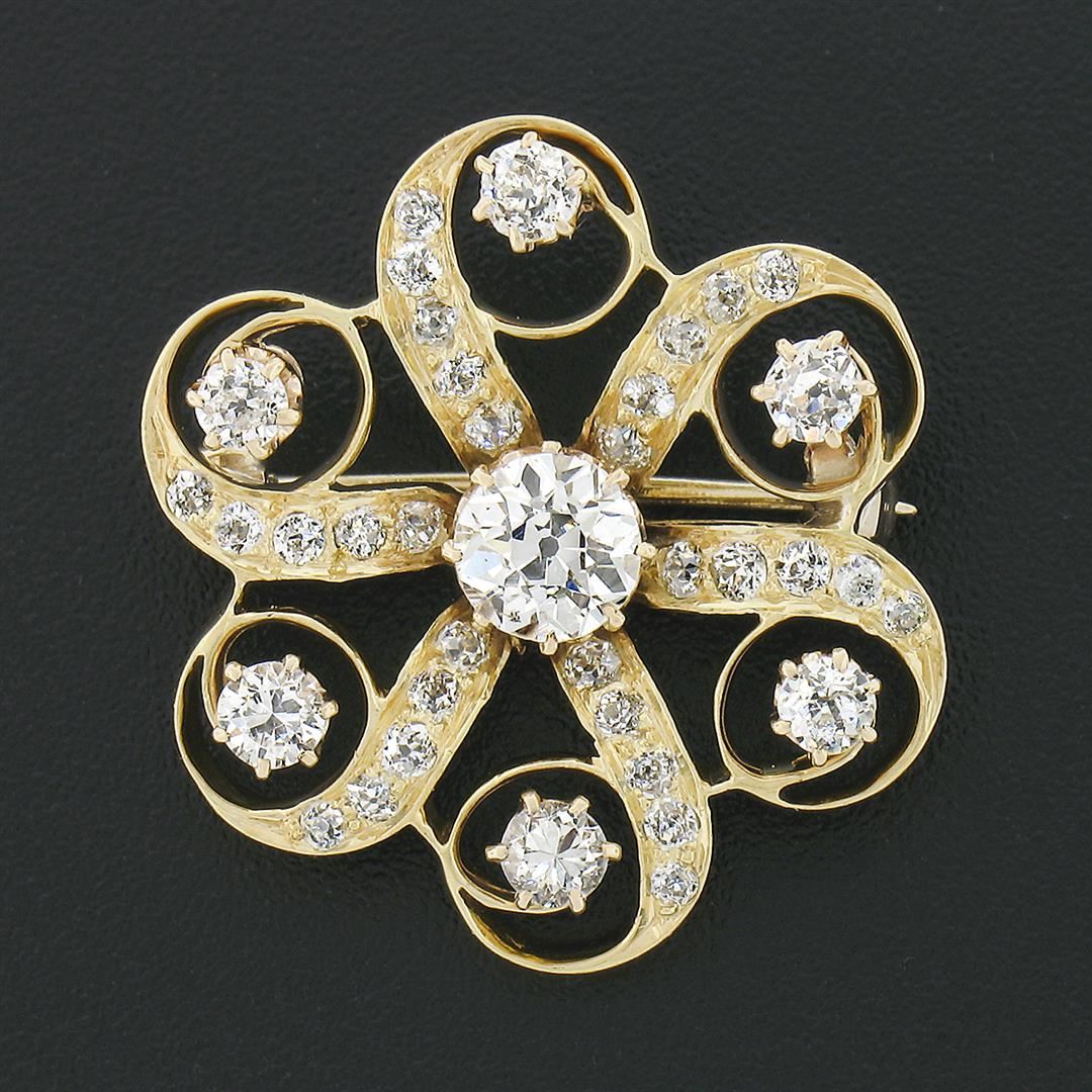 An antique victorian solid 18k yellow gold swirl flower pin brooch, with 37 old european cut natural diamonds (G/H - VS2/SI1 ; 1.97ctw). Measures 25.20x22.90mm and weighs a total of 6.61 grams.