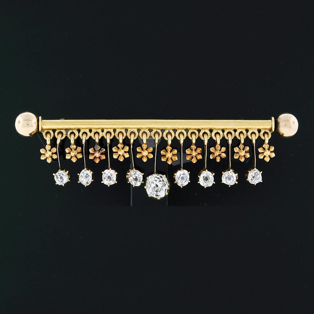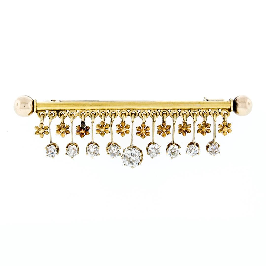 An antique solid 18k yellow gold pin brooch, with 1 cushion old mine cut natural diamond (J- SI1; 0.90ct), and 8 old mine cut natural diamonds (I/J- VS1-SI1; 1.50ctw). Measures 21.49x68.69mm and weighs a total of 11.80 grams.