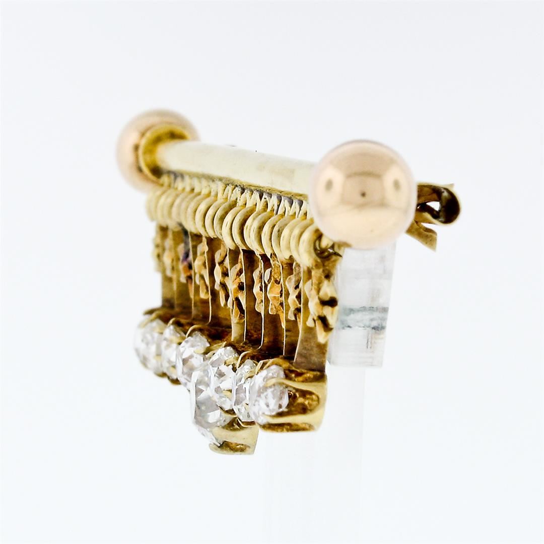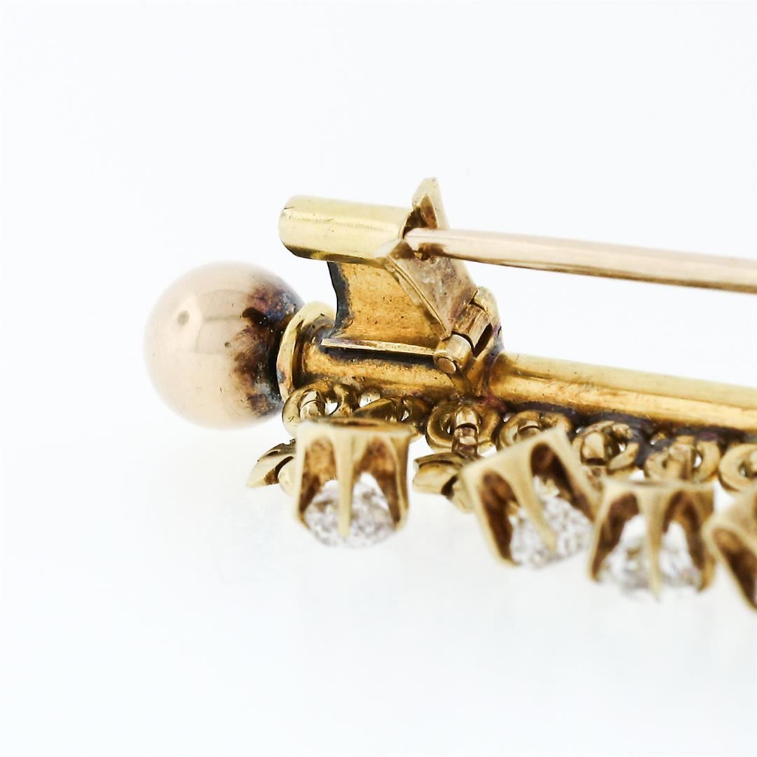 An antique solid 18k yellow gold pin brooch, with 1 cushion old mine cut natural diamond (J- SI1; 0.90ct), and 8 old mine cut natural diamonds (I/J- VS1-SI1; 1.50ctw). Measures 21.49x68.69mm and weighs a total of 11.80 grams.