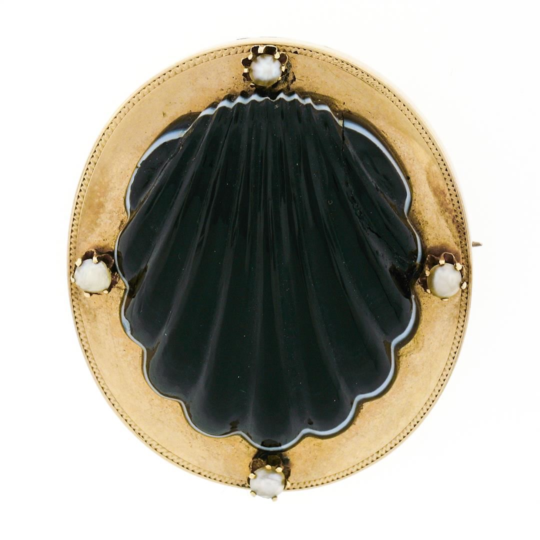 An antique solid 18k yellow gold locket brooch, with 1 carved natural banded agate (31.61x26.15mm), and 4 round cabochon cut natural cultured pearls (3.0mm). Measures 40.03x35.37mm and weighs a total of 19.67 grams.