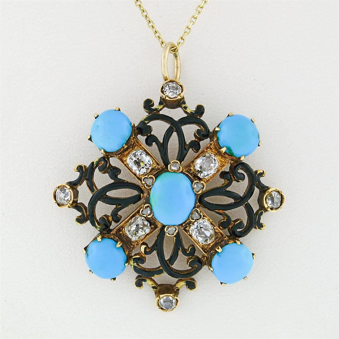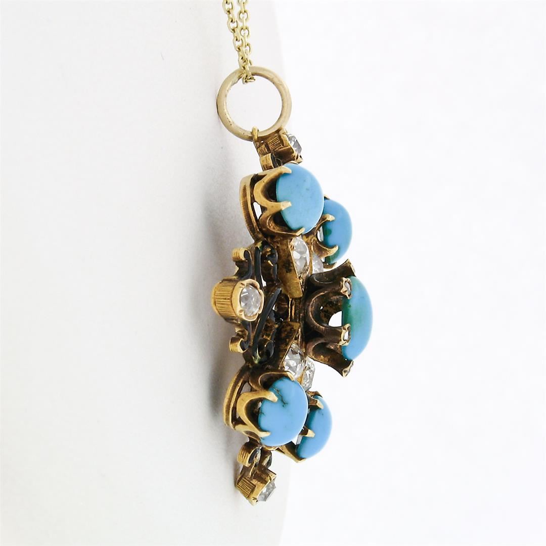 A Victorian solid 18k rosy yellow gold pendant necklace, with 1 oval cabochon cut natural turquoise (7.67x6.19mm), and round cabochon cut natural turquoise (6.05mm), with 4 oval old mine cut natural diamonds (H/I - VS1/VS2 ; 1.00ctw), and 4 old mine cut natural diamonds (H/J - SI1/I1 ; 0.30ctw), with 6 round rose cut natural diamonds (H/J Color - SI1/ I1 ; 0.08ctw). 23.99 inch solid 14k yellow gold beveled fine cable link chain, 12.06 grams total weight, pendant measures 38.41x32.94mm.