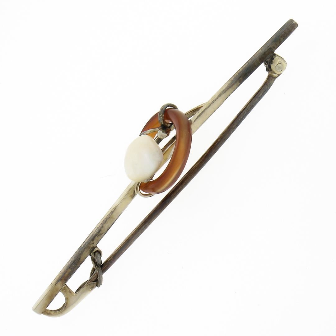 An antique solid 9k yellow gold bar pin brooch, with round ring natural carnalian (11mm), and 1 baroque pearl. Measures 48x11mm and weighs a total of 1.74 grams.