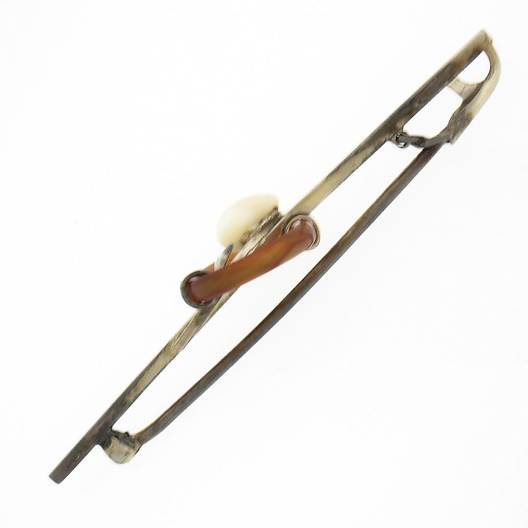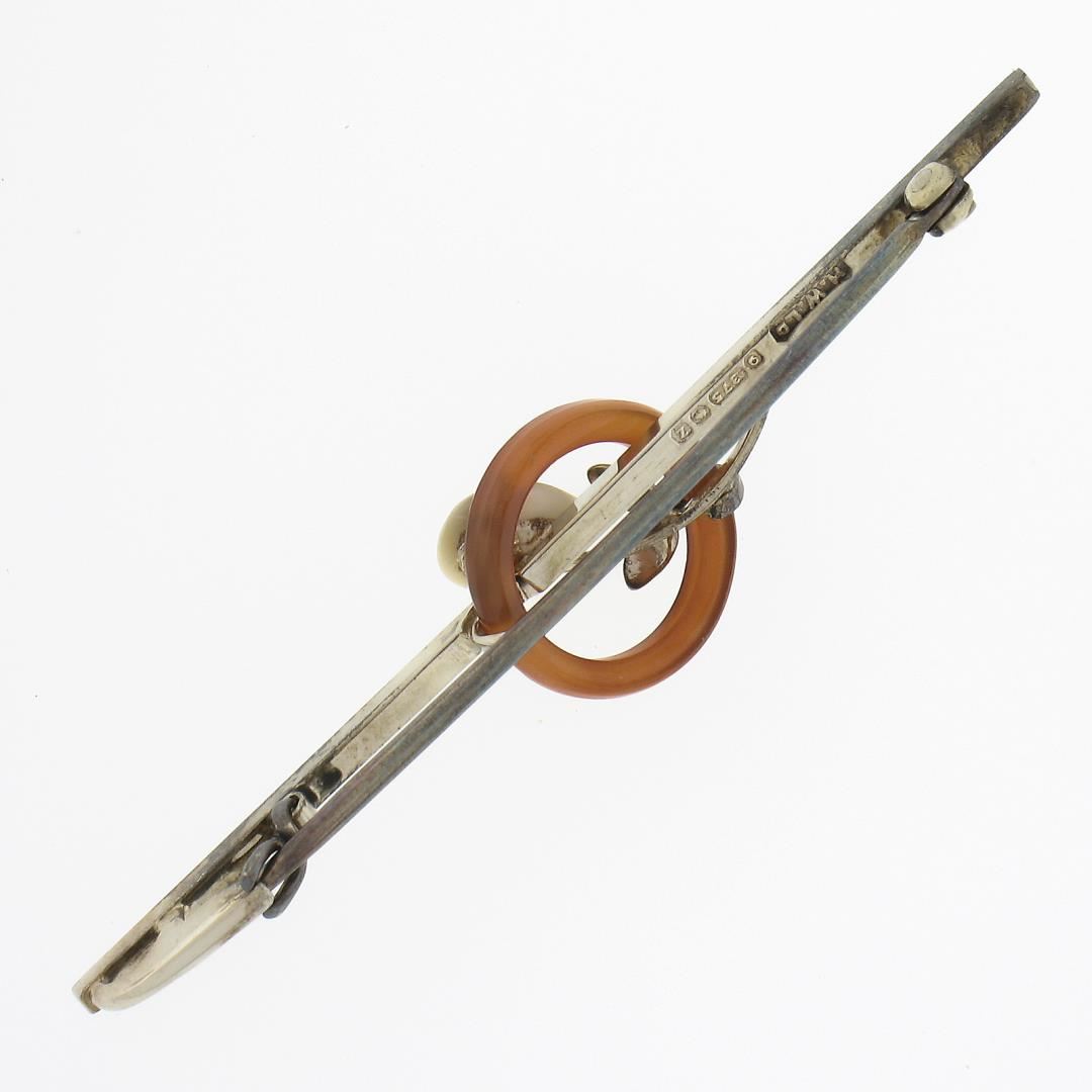 An antique solid 9k yellow gold bar pin brooch, with round ring natural carnalian (11mm), and 1 baroque pearl. Measures 48x11mm and weighs a total of 1.74 grams.