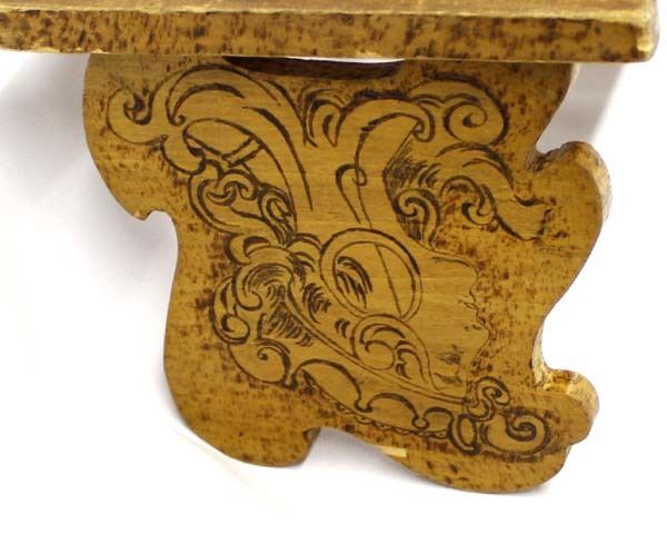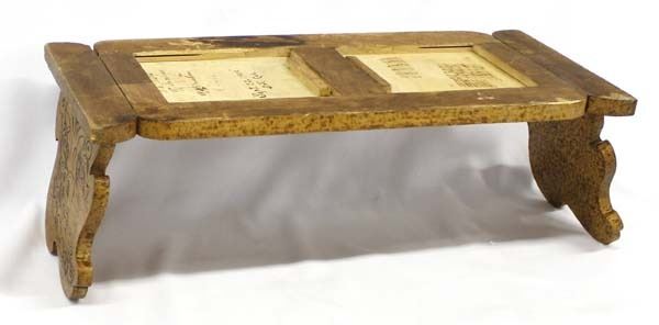 Antique Victorian Carved Wood Pyrography (Pyrogravure) Sliding/Expandable Book Rack, measures 7.5'' x 17.5'' (fully extended), there are 2 Victorian style women's heads woodburned on each end, the front area is completely covered with woodburned designs, on the back there are 5 woodburned names on one side of the sliding panel (W. G. Wiester, A. Frahm, F. Shodt, R. H. Frahm, and R. Jones) and the date ''Sept. 22, 1903.'' S.F. Cal. and on the other sliding panel there are woodburned marks (like they were keeping track of days), perhaps these people were in prison?, perhaps they were on a ship?