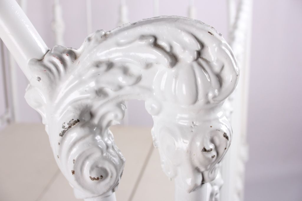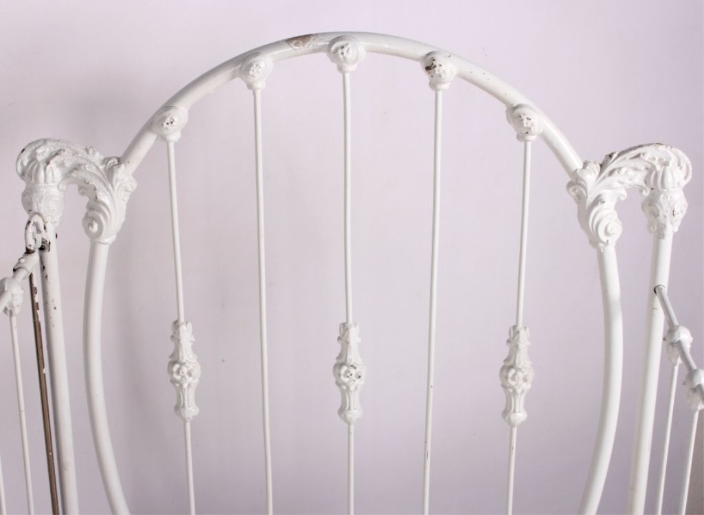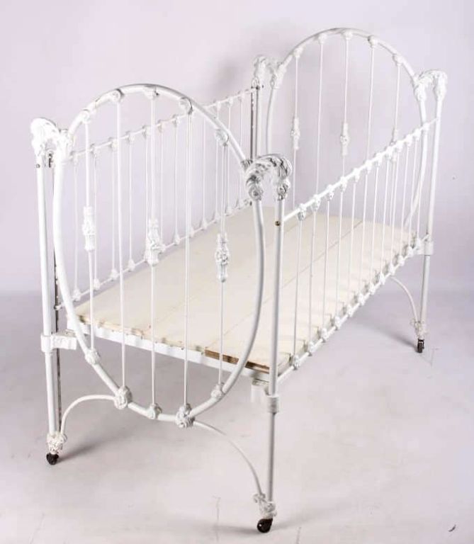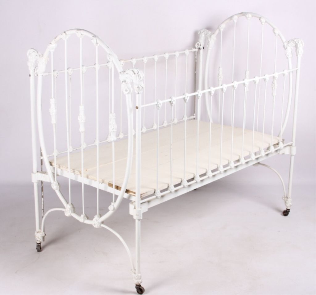 This is a cast iron crib showing great condition showing great detailed pieces and an oval end design. The crib could easily be transformed into a day bed or love seat. Rare piece measures 55"x30"x47"
