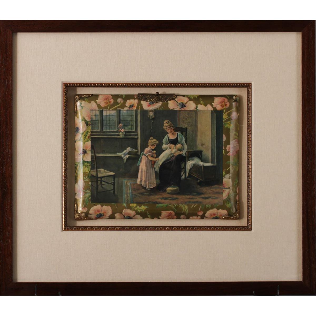 An antique Victorian celluloid album cover titled Mother With Daughters. Framed and ready to hang. Antique gold fillet shadow box frame. Measures approximately 19 x 17 inches (frame).