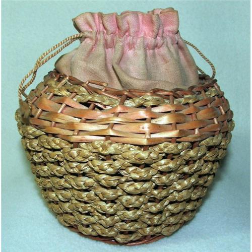 Turn of the century Victorian woman's drawstring wicker purse, in natural and pink. The purse appears to be made from braided raffia, reed or cane, and a fine fabric, perhaps silk. The basketry portion measures about 4.5 inches high, 6.5 inches wide, and 6 inches deep. The pink has faded on this purse and there is some surface wear. The wicker has some breaks and there is tearing where the fabric meets the basketry. Please refer to the 4 photographs for general appearance and condition. Shipping / packaging will be $10.00.