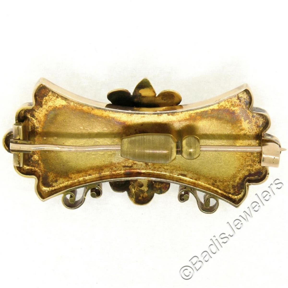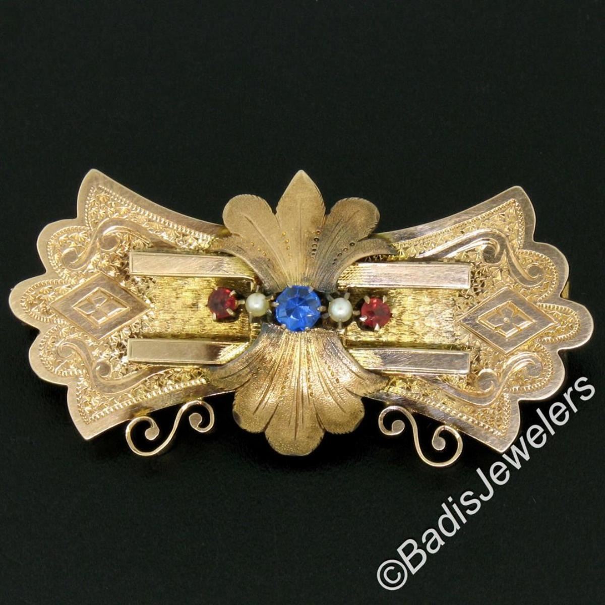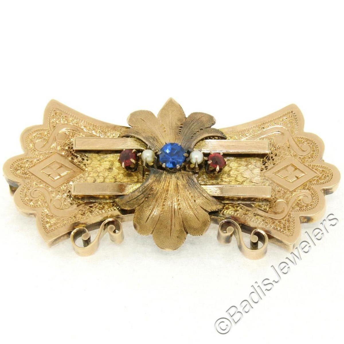 An hand engraved antique Victorian era solid 9k rose gold brooch with a round synthetic sapphire flanked by 2 cultured pearls (2.0mm) and 2 synthetic rubies. Measures 25.55x52.60mm and weighs a total of 10.63 grams.