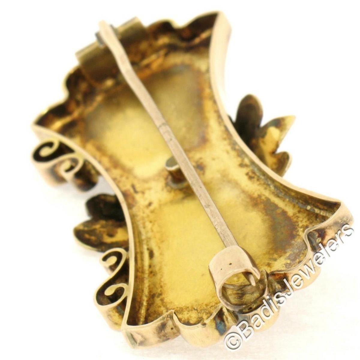 An hand engraved antique Victorian era solid 9k rose gold brooch with a round synthetic sapphire flanked by 2 cultured pearls (2.0mm) and 2 synthetic rubies. Measures 25.55x52.60mm and weighs a total of 10.63 grams.