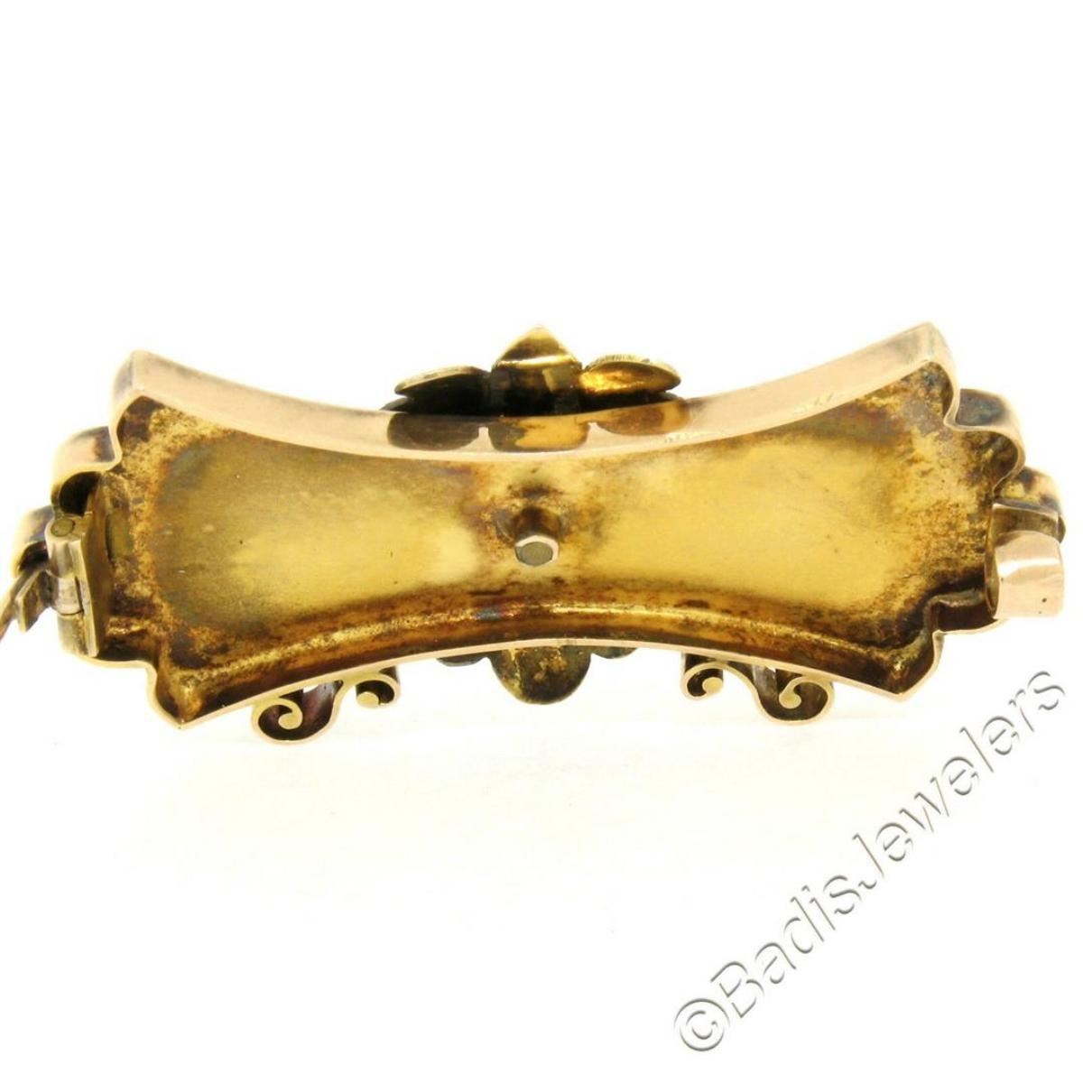 An hand engraved antique Victorian era solid 9k rose gold brooch with a round synthetic sapphire flanked by 2 cultured pearls (2.0mm) and 2 synthetic rubies. Measures 25.55x52.60mm and weighs a total of 10.63 grams.