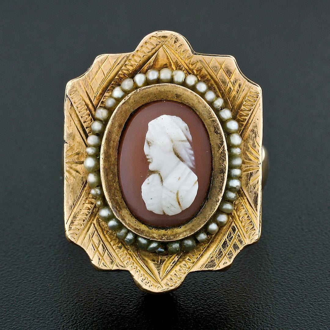 A Victorian solid 10k yellow gold cameo ring, with 1 oval shape carved agate (11.73x8.77mm), surrounded with 40 oval bead shape natural seed pearls (1.50x0.85mm). The ring is size 9.0, weighs a total of 12.82 grams, and measures 24.88mm wide.