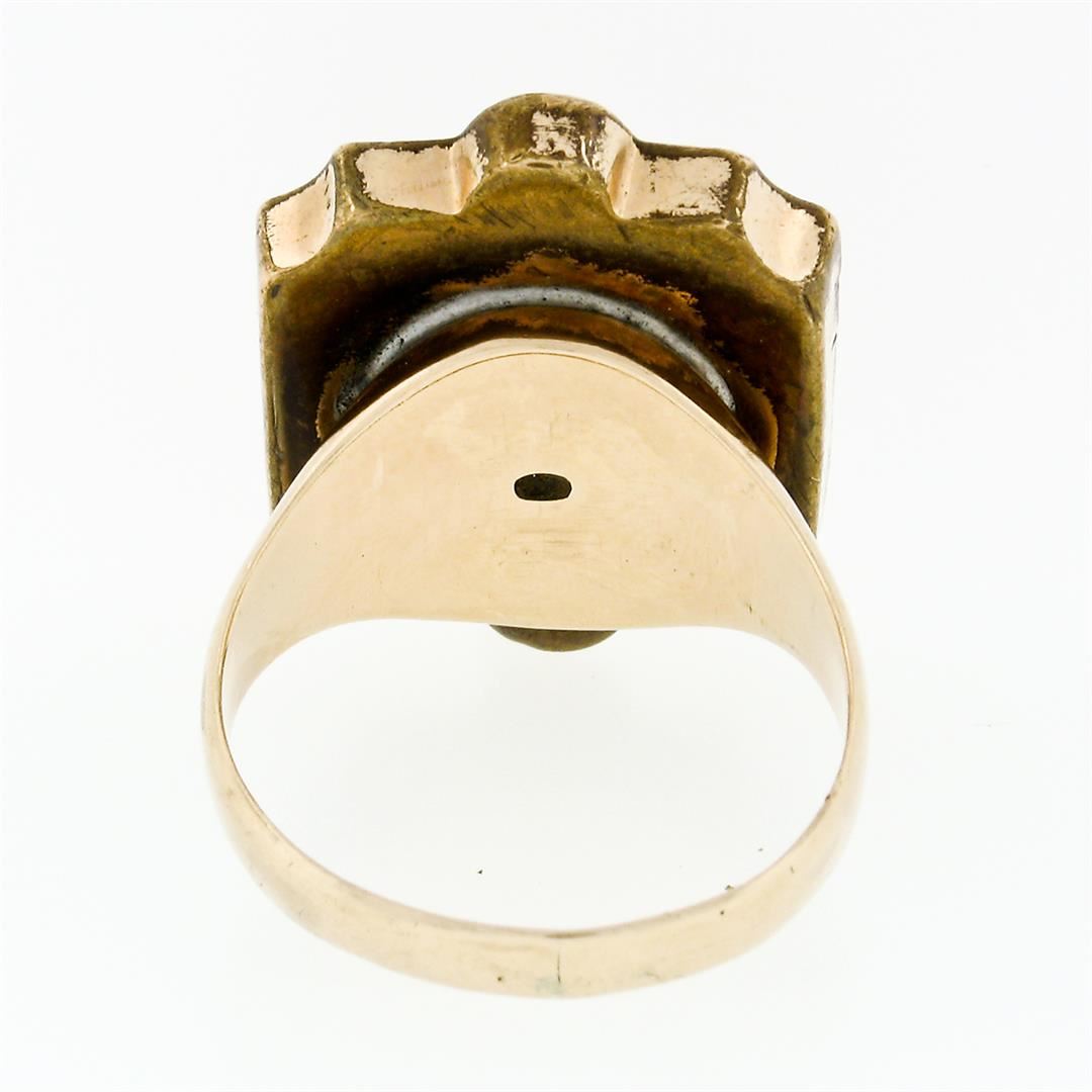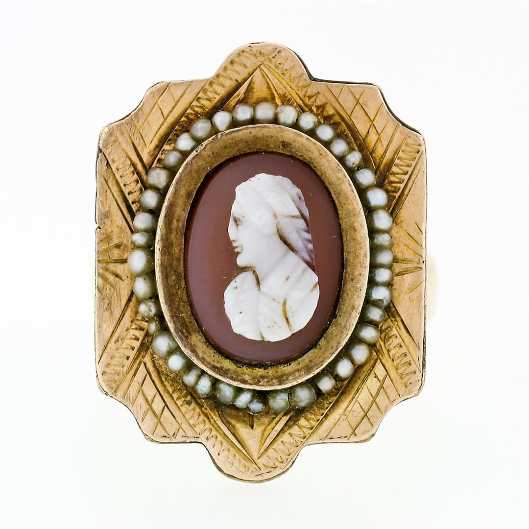 A Victorian solid 10k yellow gold cameo ring, with 1 oval shape carved agate (11.73x8.77mm), surrounded with 40 oval bead shape natural seed pearls (1.50x0.85mm). The ring is size 9.0, weighs a total of 12.82 grams, and measures 24.88mm wide.