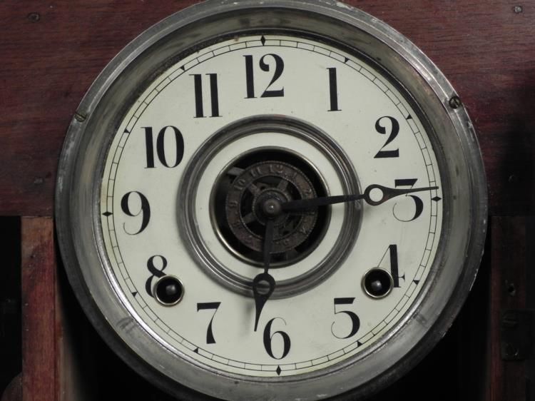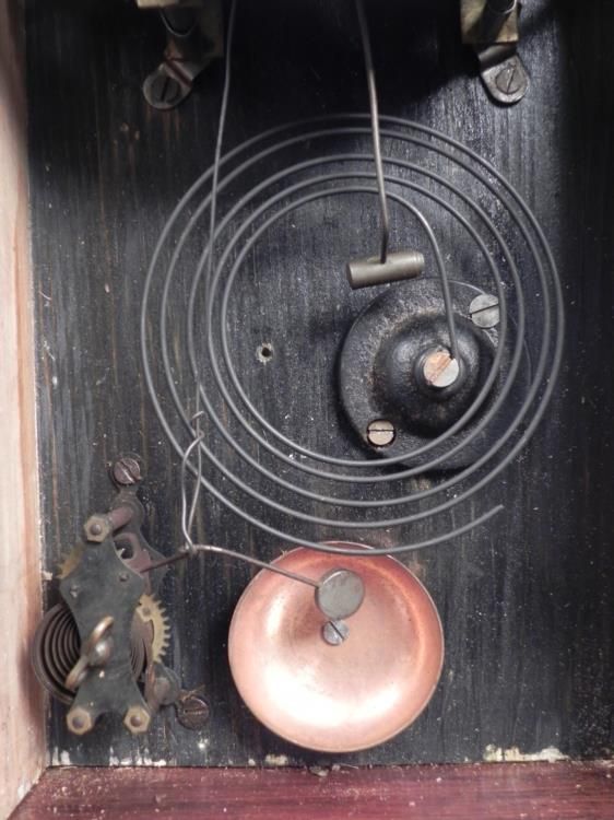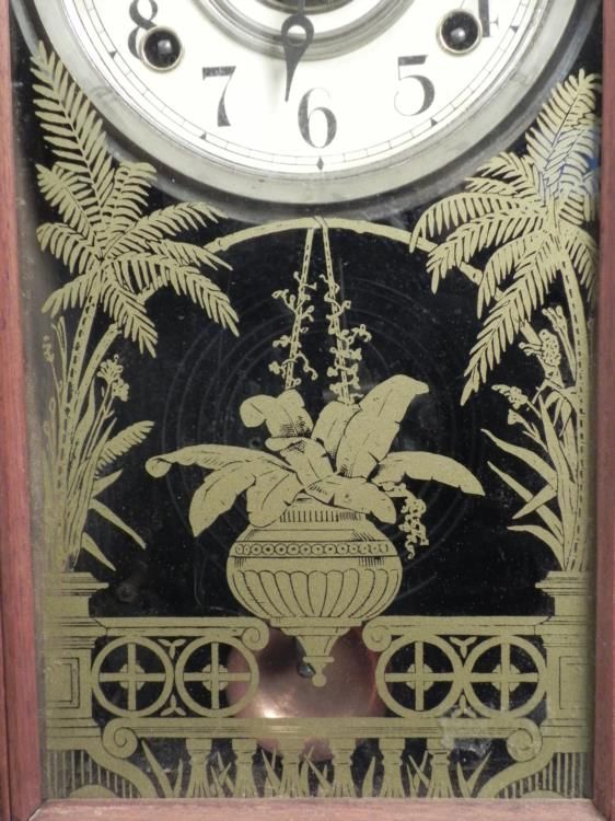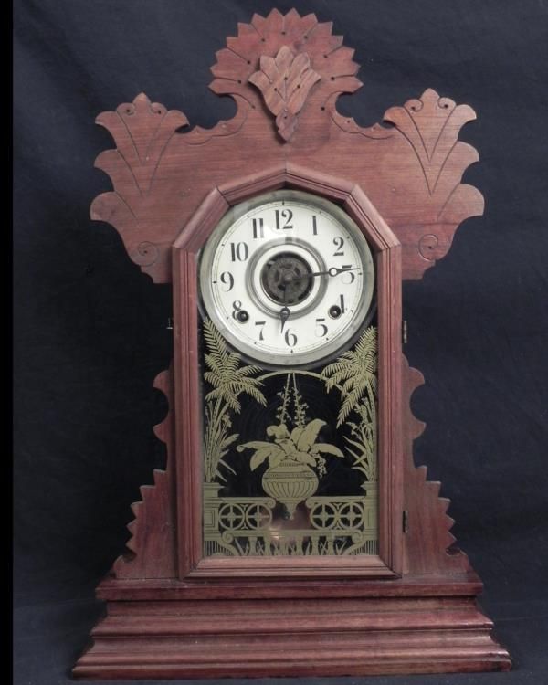 This gingerbread mantel clock has an elegant design, and the added feature of an alarm. The beatifully constructed oak case has nicely cut patterns. The pendulum is painted gold. The glass front has a gilt stencilled scene of a gated terrace, with ferns a