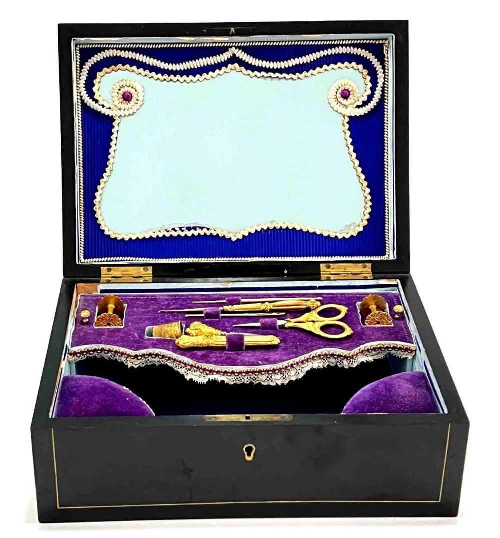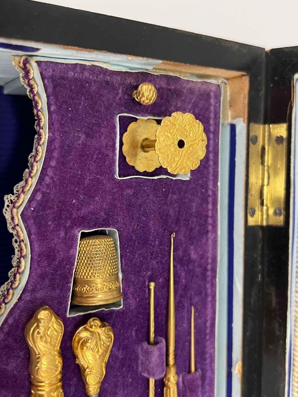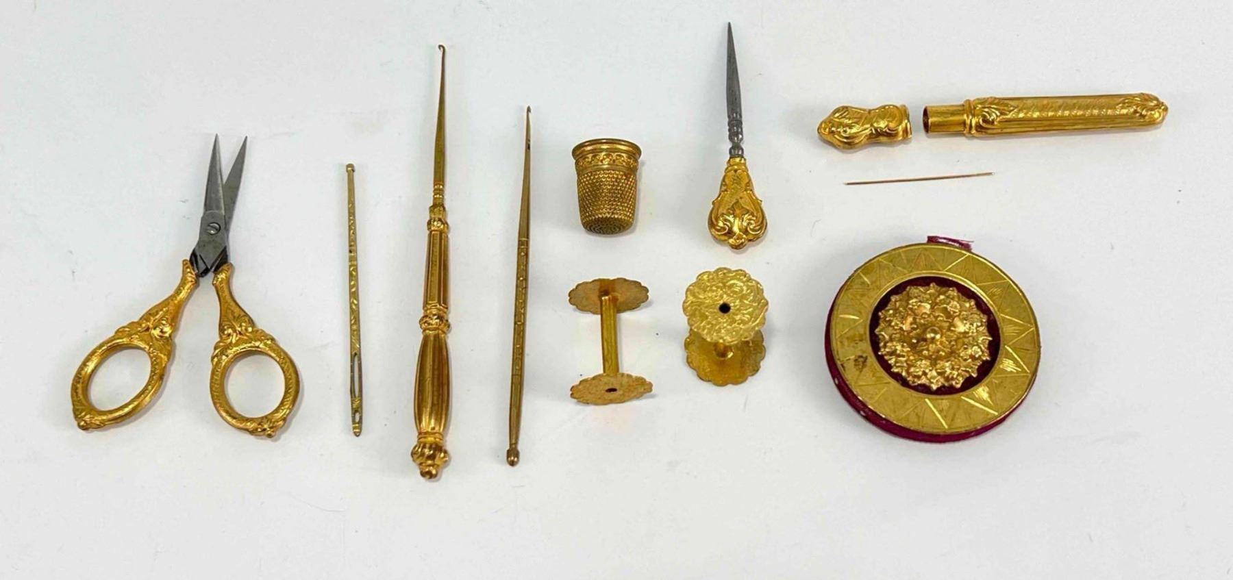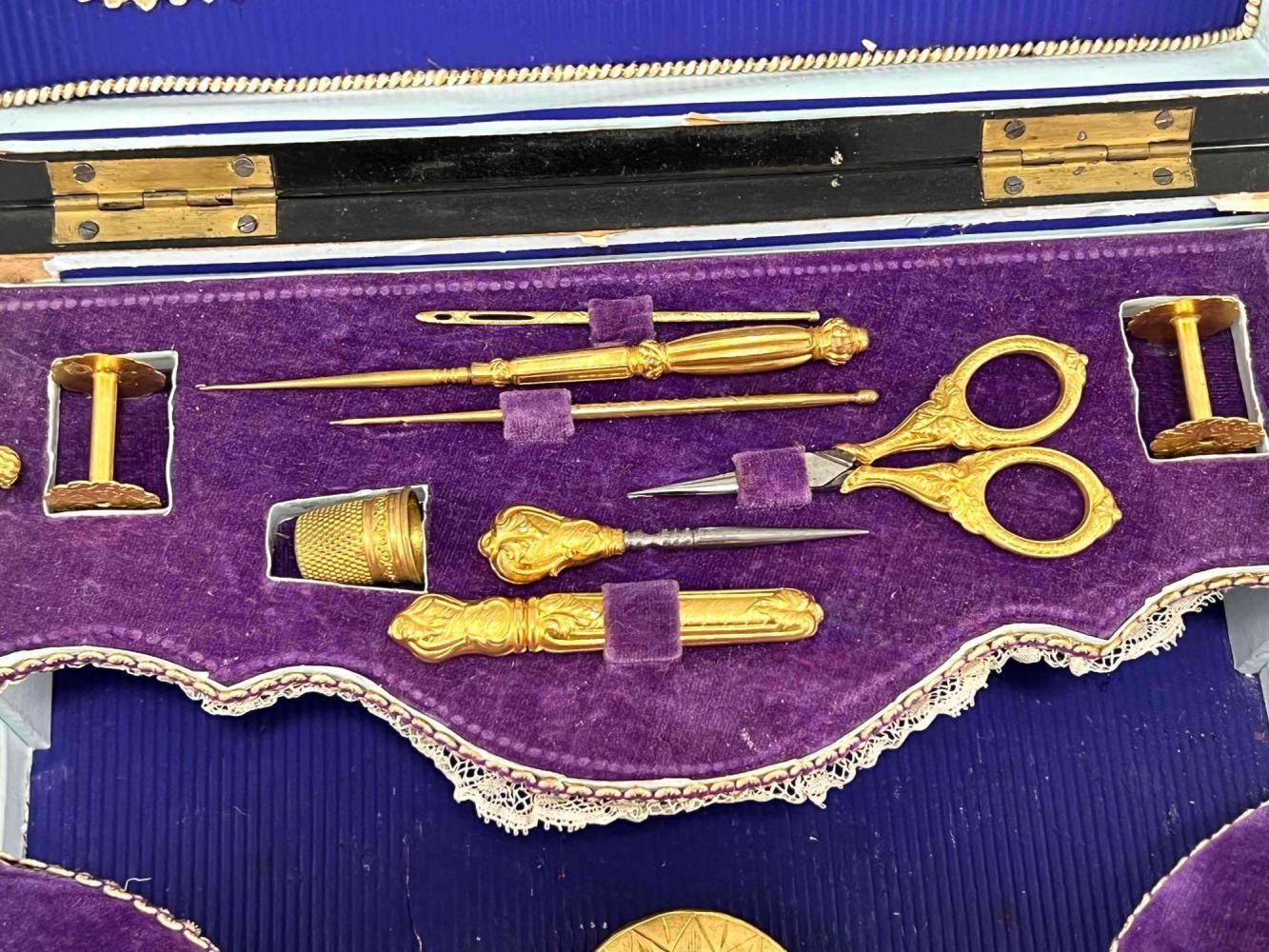 Antique Victorian Sewing Box With 9 Highly Decorative Pieces Of Sewing Equipment Including Scissors, Needle Box, Needle Threaders, And Bobbins. Includes Key. Box Approximately 9.5 L x 7 W x 3.75 D Inches. Smallest Item Approximately 0.5 L x 025 W x 0.25 D Inches.
